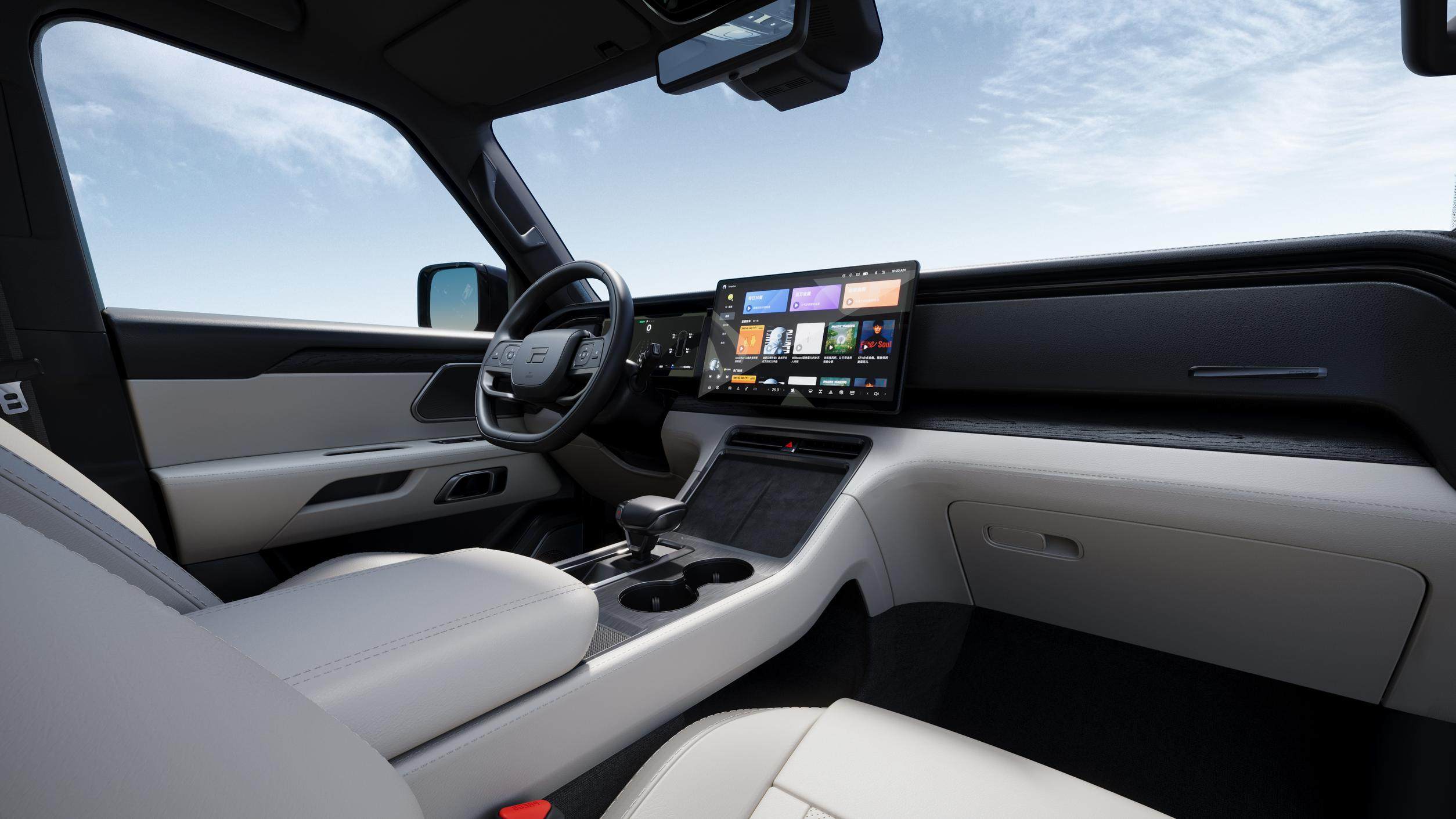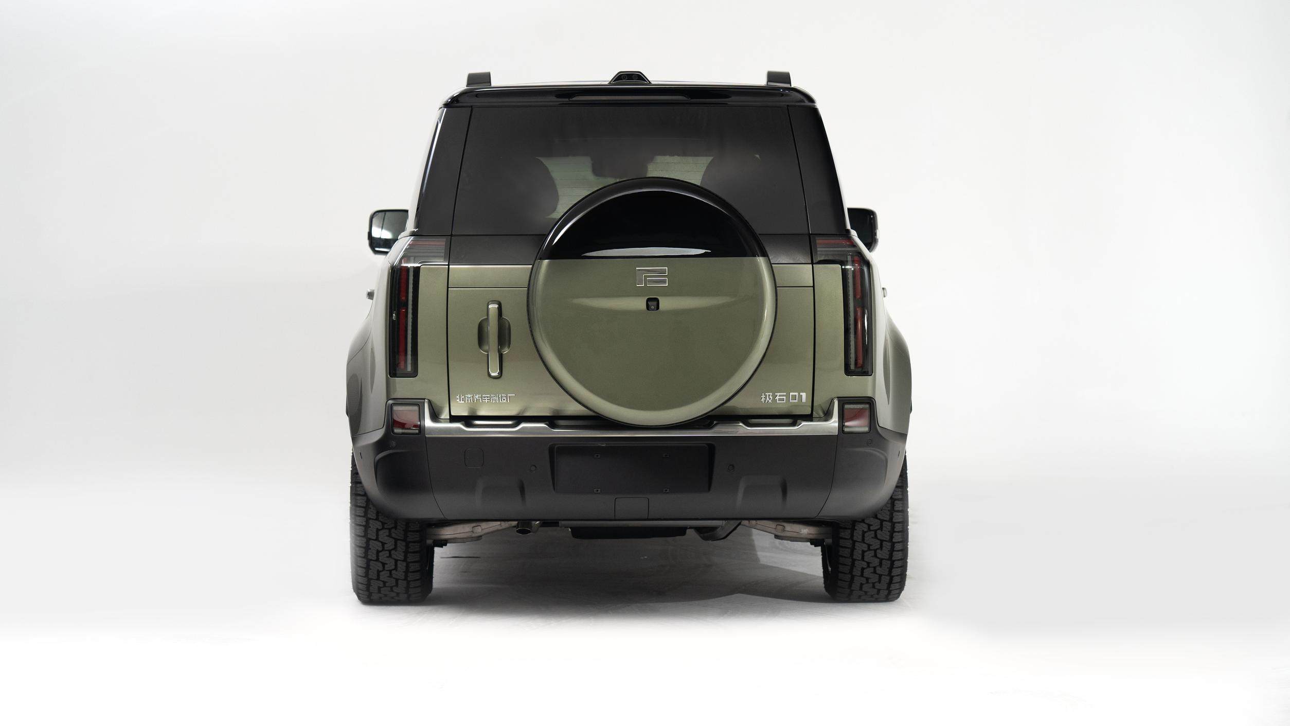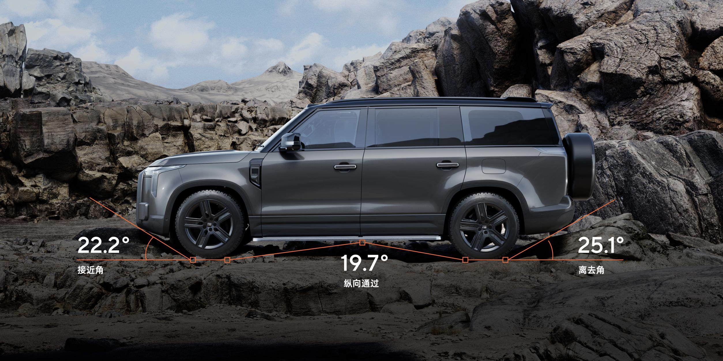 车身侧面部分,极石01造型方正,前后侧翼子板微微突出车身,肌肉感十足。此外,双色车身的设计也为其注入了时尚元素。尾部方面,极石01采用了大量的平直线条,并加入了大量的黑色涂装装饰,强化了它的硬派产品定位。尾门采用电吸式设计,可选装外挂式备胎,从而增强越野属性。车身尺寸方面,极石01的长宽高分别为5050(5295含备胎)/1980/1869mm,轴距为3010mm。