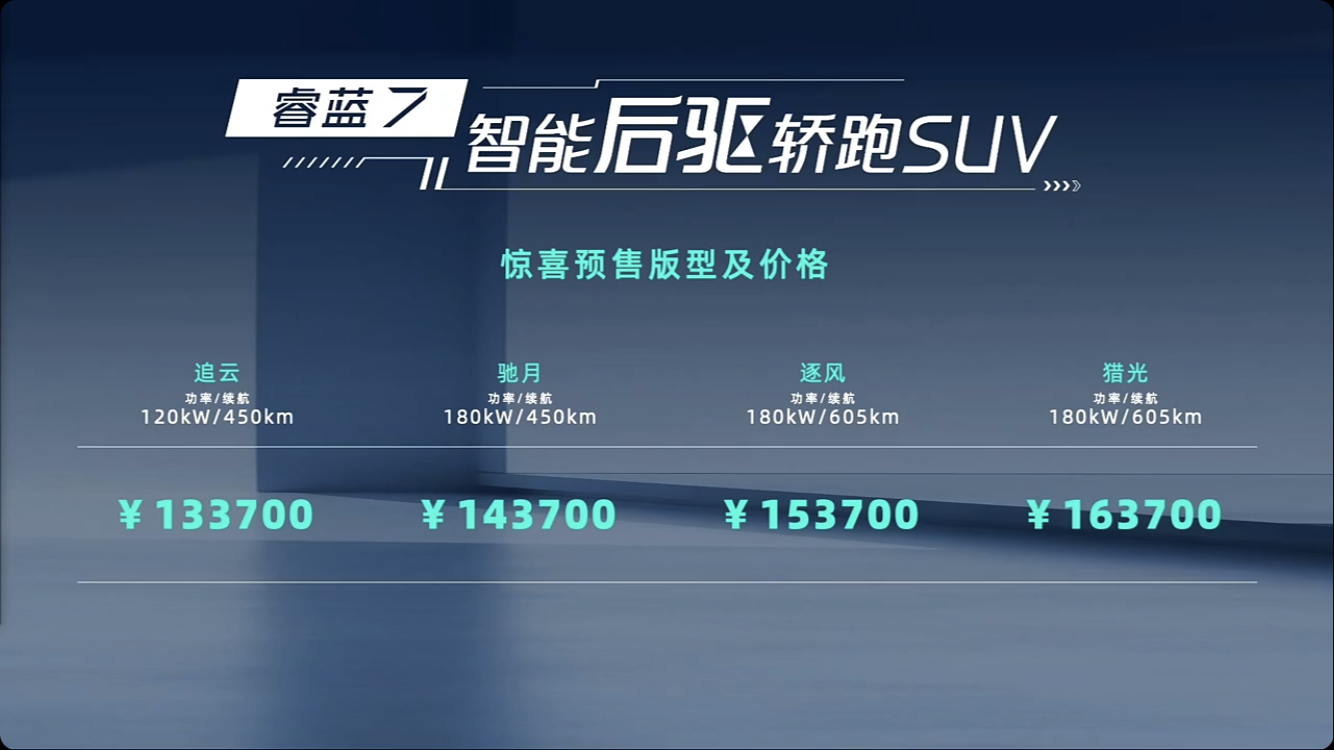 此次预售发布会现场,睿蓝汽车共发布了睿蓝7的4款车型——追云版、驰月版、逐风版、猎光版,续航区间为450-605Km,功率至高180kW,预售价格区间为13.37万元—16.37万元,不难看出,睿蓝7这一次真的将诚意拉满——以15万级的价格,突破600公里续航。