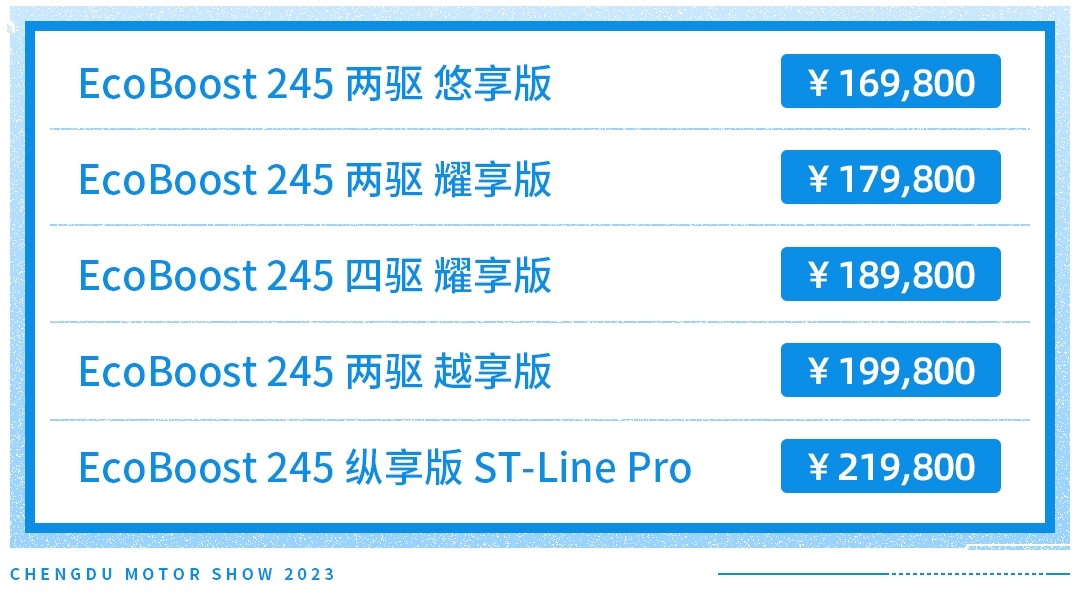 新车共推出五款车型,其中三款两驱,两款四驱,起售价与现款同为16.98万元,顶配21.98万的价格则比现款稍微便宜了2000块,很明显能看出福特希望能用“减价增配”等方法来提升锐际的销量。