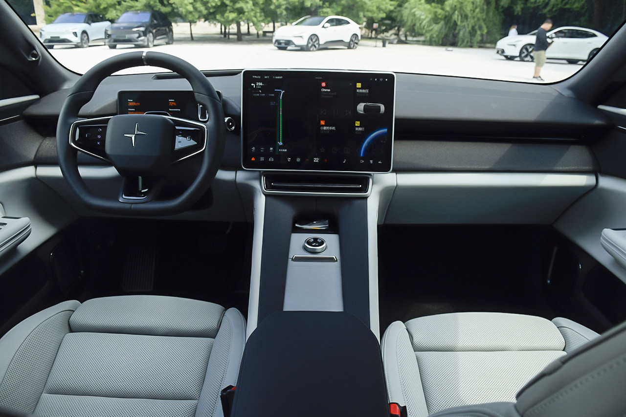 走进极星 4车内的第一个感觉就是“通透”,这种通透的呈现是多方面的,首先是空间上的通透,极星 4前挡风玻璃底部位置进行了前移,同时引擎盖高度得以降低,前者增强了车内的空间感,后者则带来了更为宽广的前部视野。