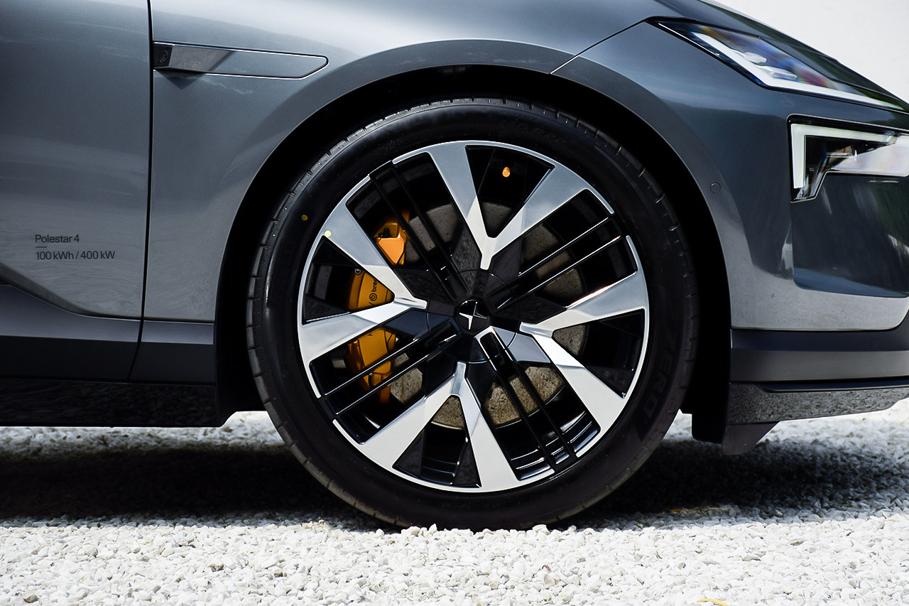 教授实拍的是高配车型,原厂就配备了前/后265/40 R22的轮胎,轮胎品牌系列为倍耐力的P ZERO PZ5,纯电专用。另外值得注目的就是极星 4巨大的金色涂装制动卡钳,在Polestar品牌中,瑞典金色涂装意味着高性能,通常分布在制动卡钳、安全带以及轮胎气门盖这些地方,相较于其它豪华品牌的高性能设计来说,极星算是非常低调的那一类了。
