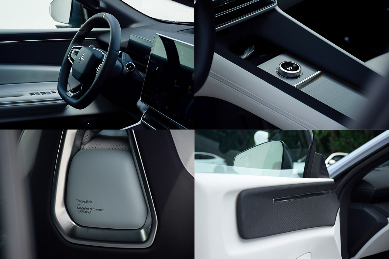 另一层面就是环保,车内所有可见纺织品都由rPET环保材料制成,座椅材质由可生物基环保材料Micro Tech制成,除此之外很多细节处还应用了很多可回收、可再生材料制作而成,Tailored Knit编织面料在极星4上的应用也是汽车行业中的首次全新尝试。