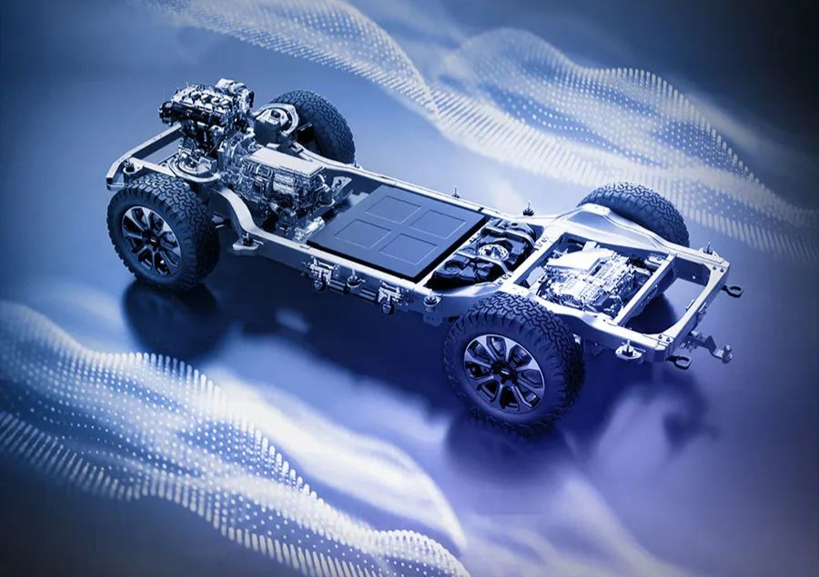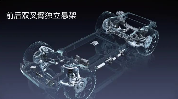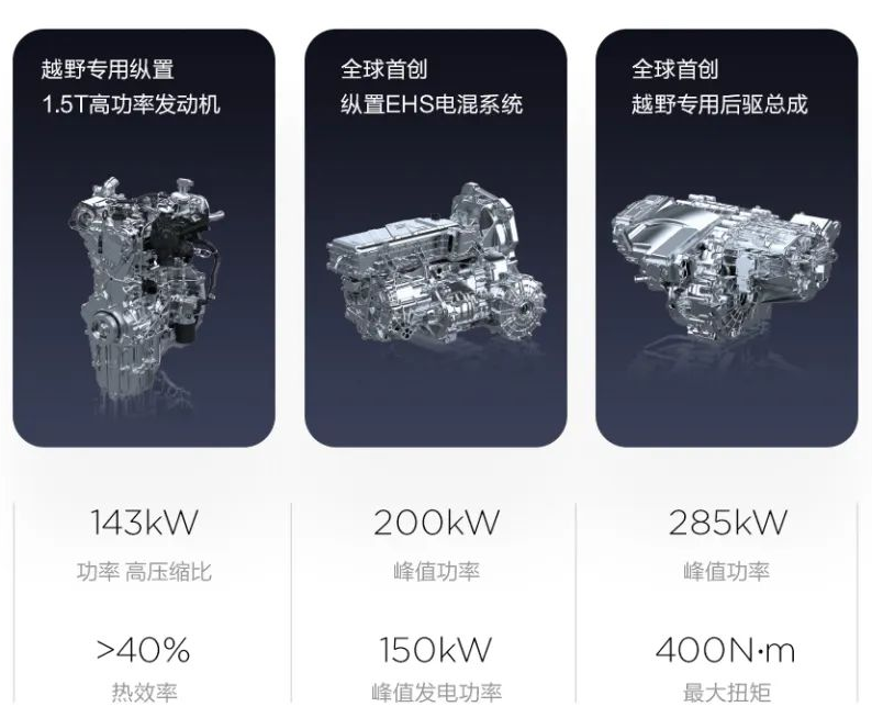 传动方面有别比亚迪的DM-i或者更高性能的DM-p,由于豹5非承载式带大梁的车身,像DM-P这样横置串并联的结构不方便布局,所以采用了纵置的EHS电混系统,也能有足够的空间布局双叉臂独立悬架系统。