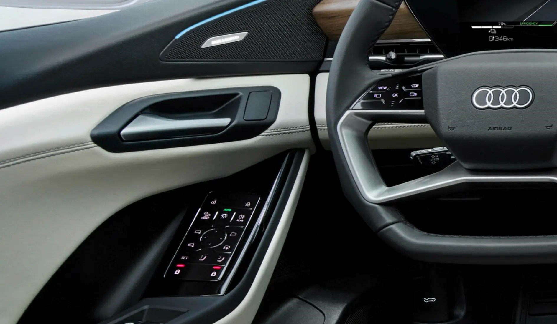 除此之外,为了驾乘舒适性和人性化设计,奥迪Q6 e-tron上依旧保留了拨杆式换挡机构、驾驶模式切换、音量调节以及空调控制等丰富的实体按键,更符合传统驾驶员的操作习惯和需求。