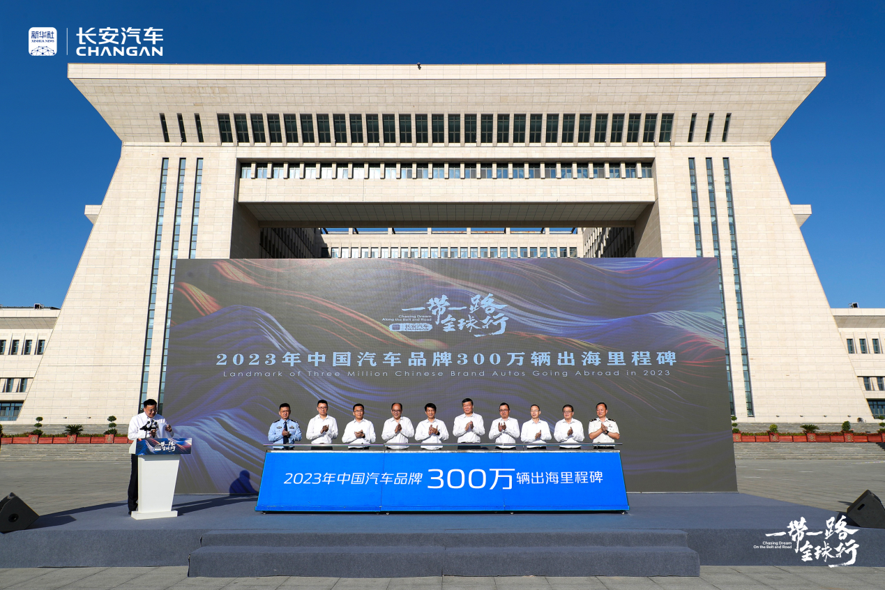 2023年9月2日,“一带一路全球行”报道团出关仪式暨2023年中国汽车品牌第300万辆出海里程碑在新疆霍尔果斯口岸举行,新华社新媒体中心主任李俊、中国汽车流通协会会长助理王都、长安汽车国际公司总经理宋爽等领导出席仪式并讲话。