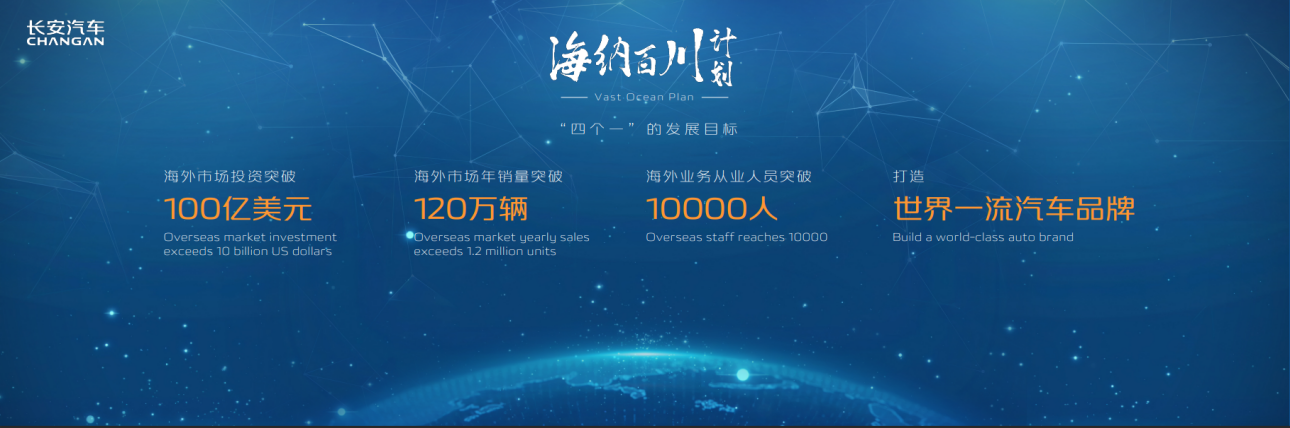 今年4月,以“和平合作、开放包容、互学互鉴、互利共赢”为指引,长安汽车开启了海外战略——“海纳百川”计划,在海外实现“四个一”发展目标,即到2030年,海外市场投资突破100亿美元,海外市场年销量突破120万辆,海外业务从业人员突破10000人,将长安汽车打造成世界一流的汽车品牌。