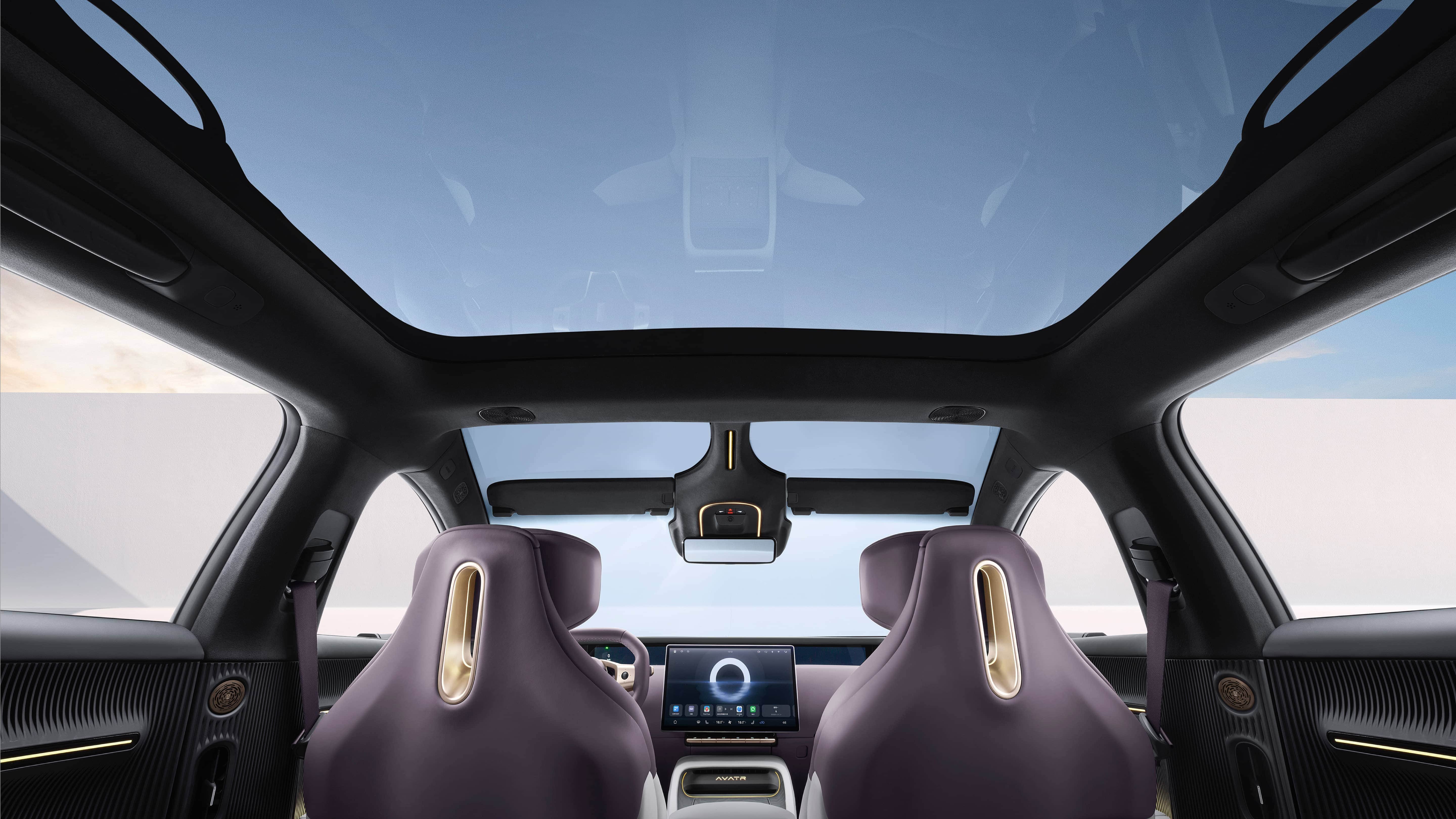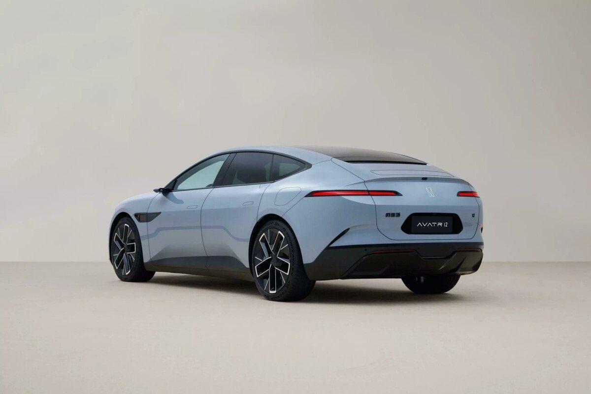阿维塔12的车尾非常动感,尾灯没有采用阿维塔11同款贯穿式尾灯,而是将细长的灯管从两侧延伸至侧面,突出中间可以点亮的车标;更为不同的是考虑到风阻系数,没有使用阿维塔11那样的垂直式尾窗,而是直接取消了尾窗,采用流媒体后视镜,并且配备了电动升降尾翼。尾部的两侧线条十分圆润,勾勒出一台豪华轿跑该有的样子。