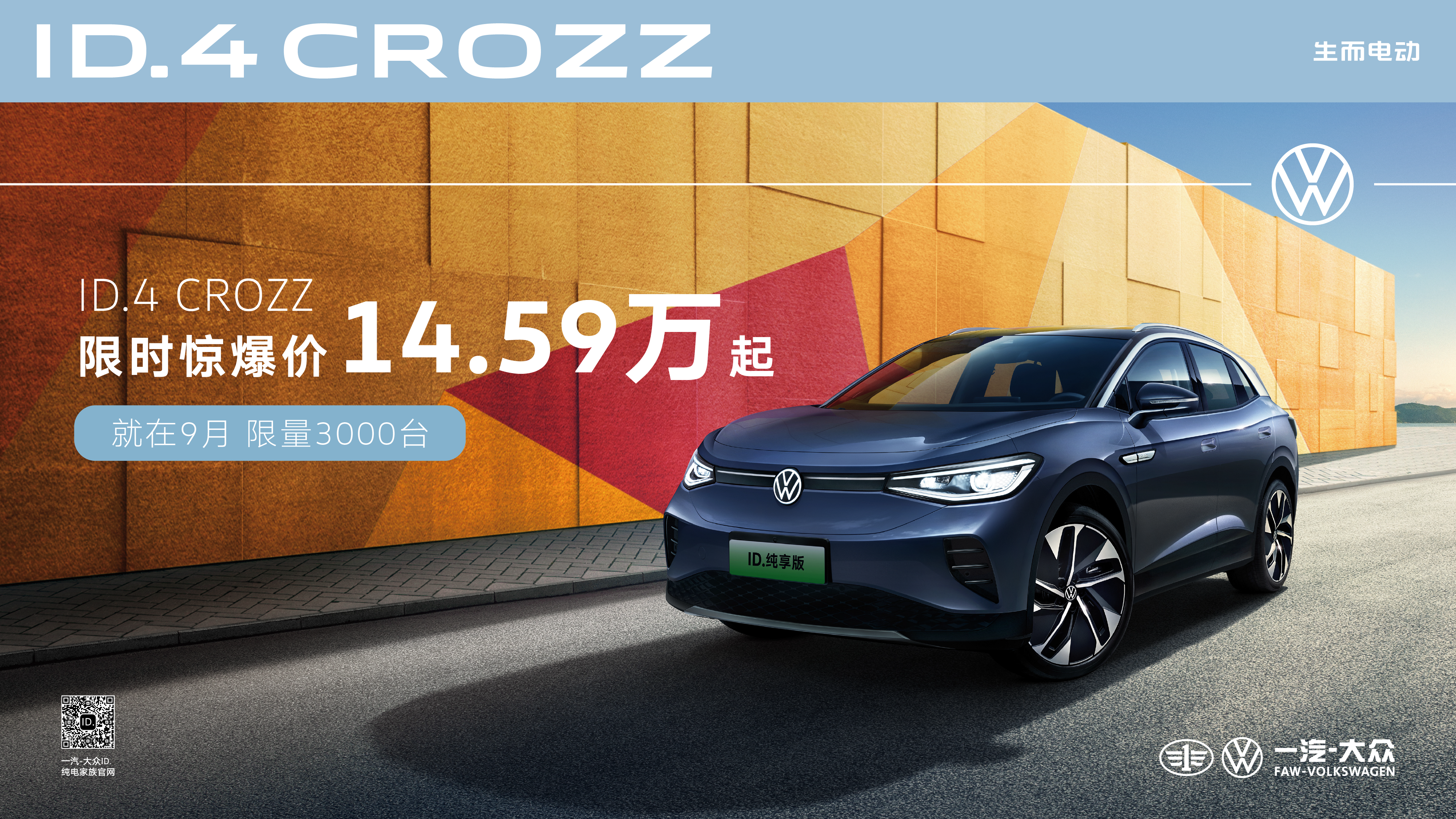 一汽-大众ID.4 CROZZ是中国目前销量最高的合资纯电汽车,累计销售已近十万台。为回馈用户长期厚爱,一汽-大众在这个金秋时节推出限时限量GO活动:9月购车,14.59万元起,限量3000台。除限时惊爆价外,用户还可享受8年16万公里三电质保、3年10万公里整车质保,以及首任车主终身免流量、老客户增换购、老客户推荐购等多项优惠政策。