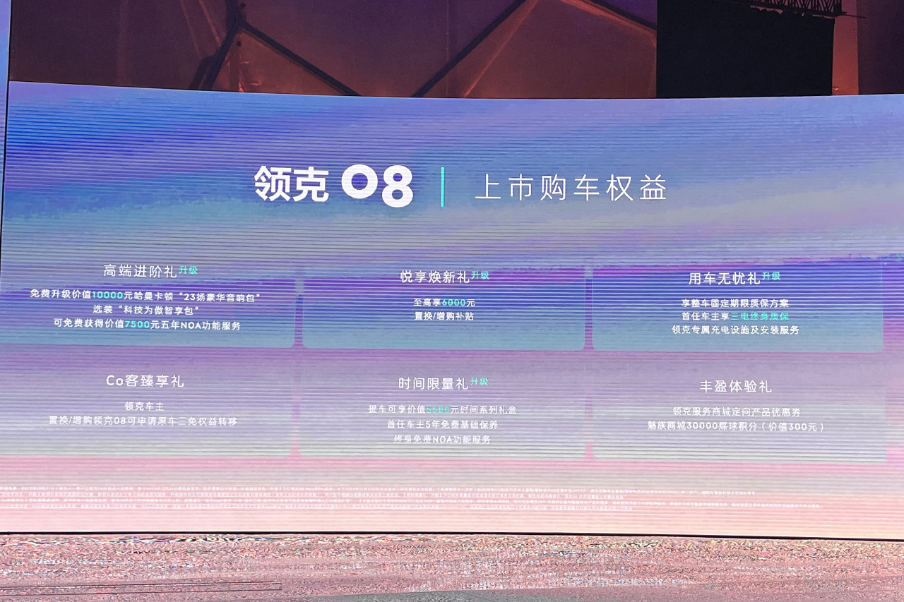 新车上市,大量限时礼遇,领克08自然也不能“免俗”,推出了7重购车礼遇,包含了全系车型可享受的9000元限时领享礼(10月31日前下订)、免费升级价值10000元哈曼卡顿23扬声器音响包的高端进阶礼、至高6000元的置换购悦享焕新礼,以及首任车主三电终身质保的用车无忧礼等,诚意十足。