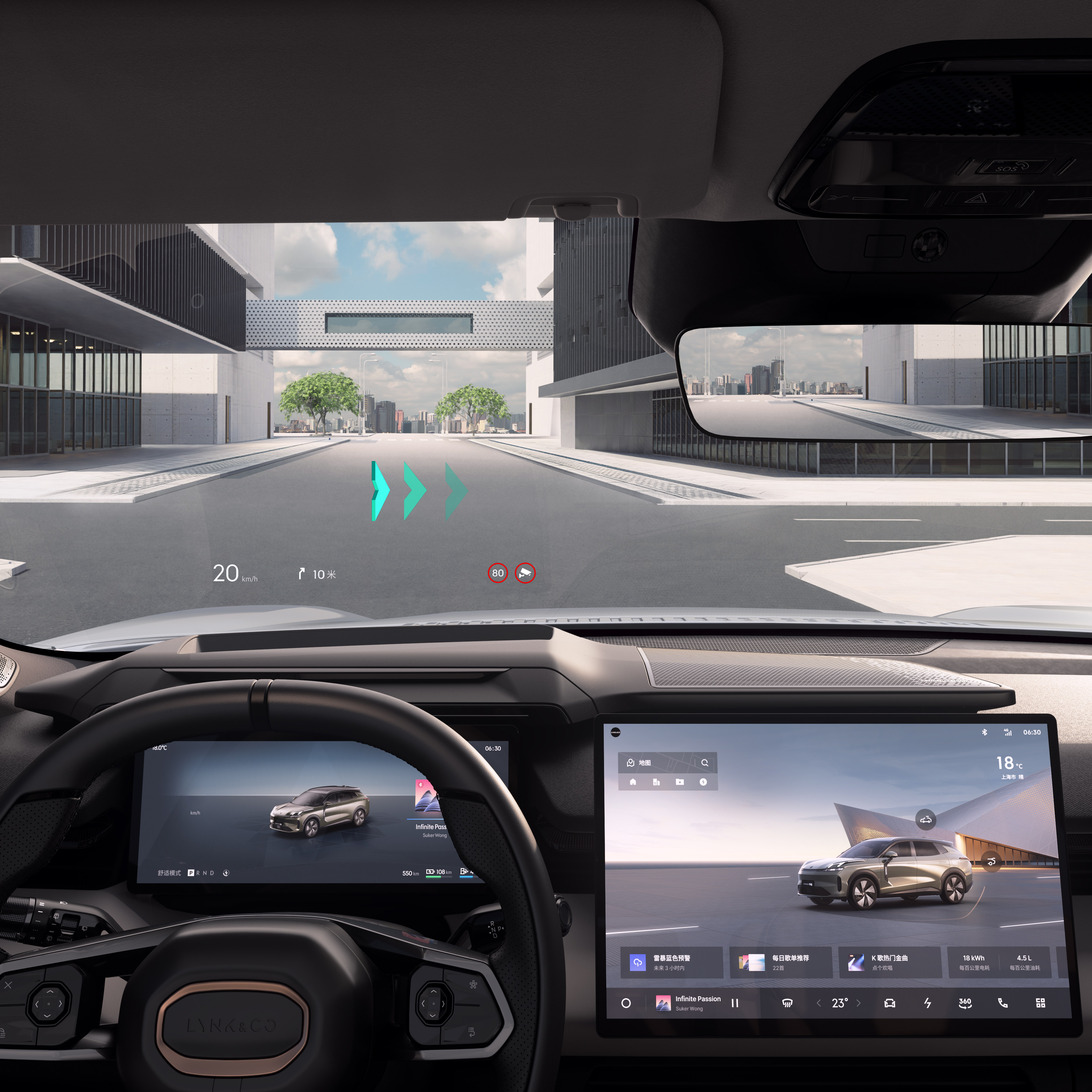 领克08还配备了目前量产尺寸最大的AR-HUD,2K分辨率,最大投影面积可达92英寸,并且该系统可以和TOF摄像头提供的眼球追踪技术联动,根据用户视线自动调节亮度以及投影位置。