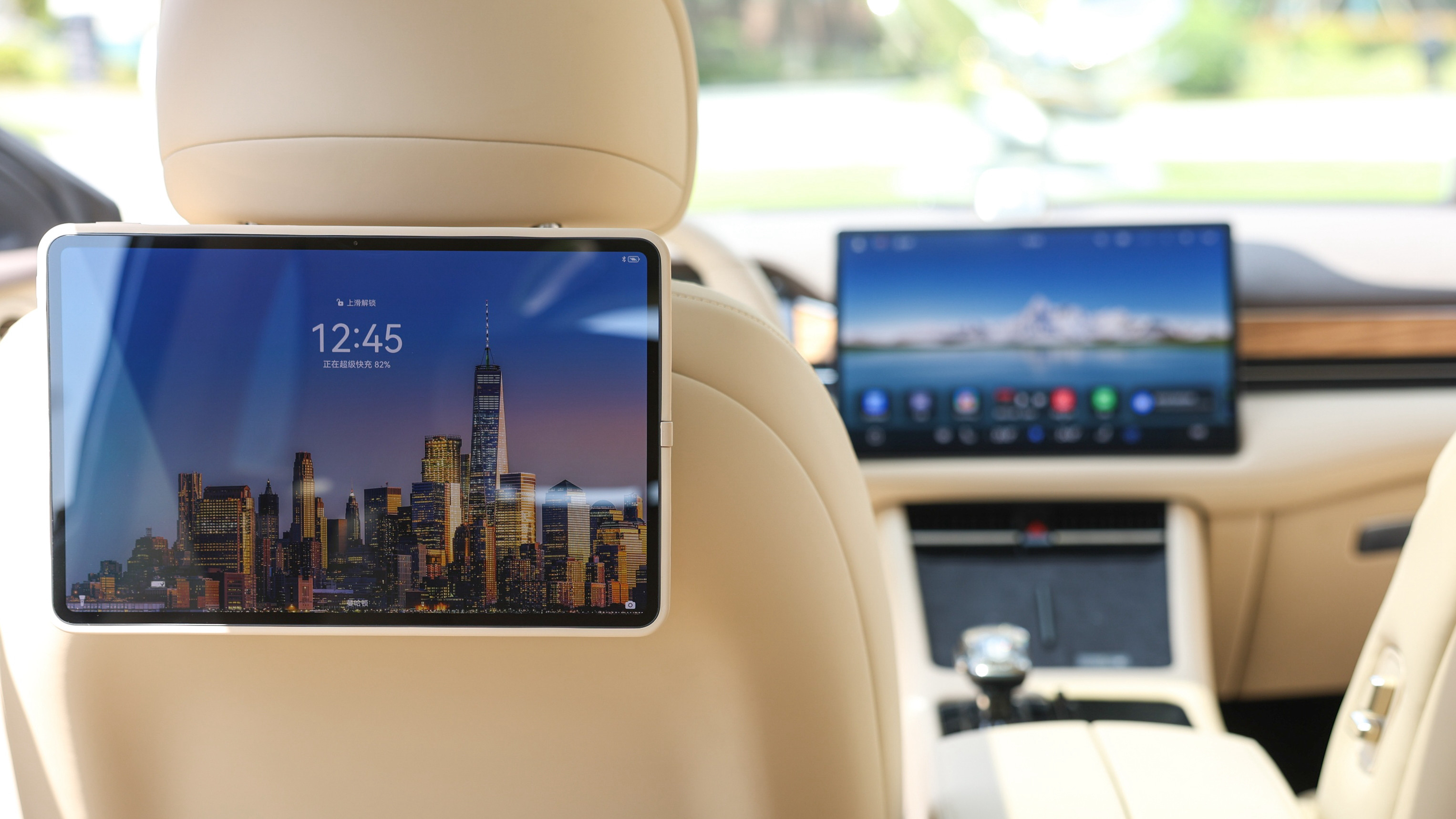 智能座舱方面,问界新M7车内最显而易见的就是10.25英寸曲面全液晶仪表,以及15.6英寸中控大屏。此外,新车后排的HUAWEI MagLink还可以装载两个华为平板,从而实现多设备联动。