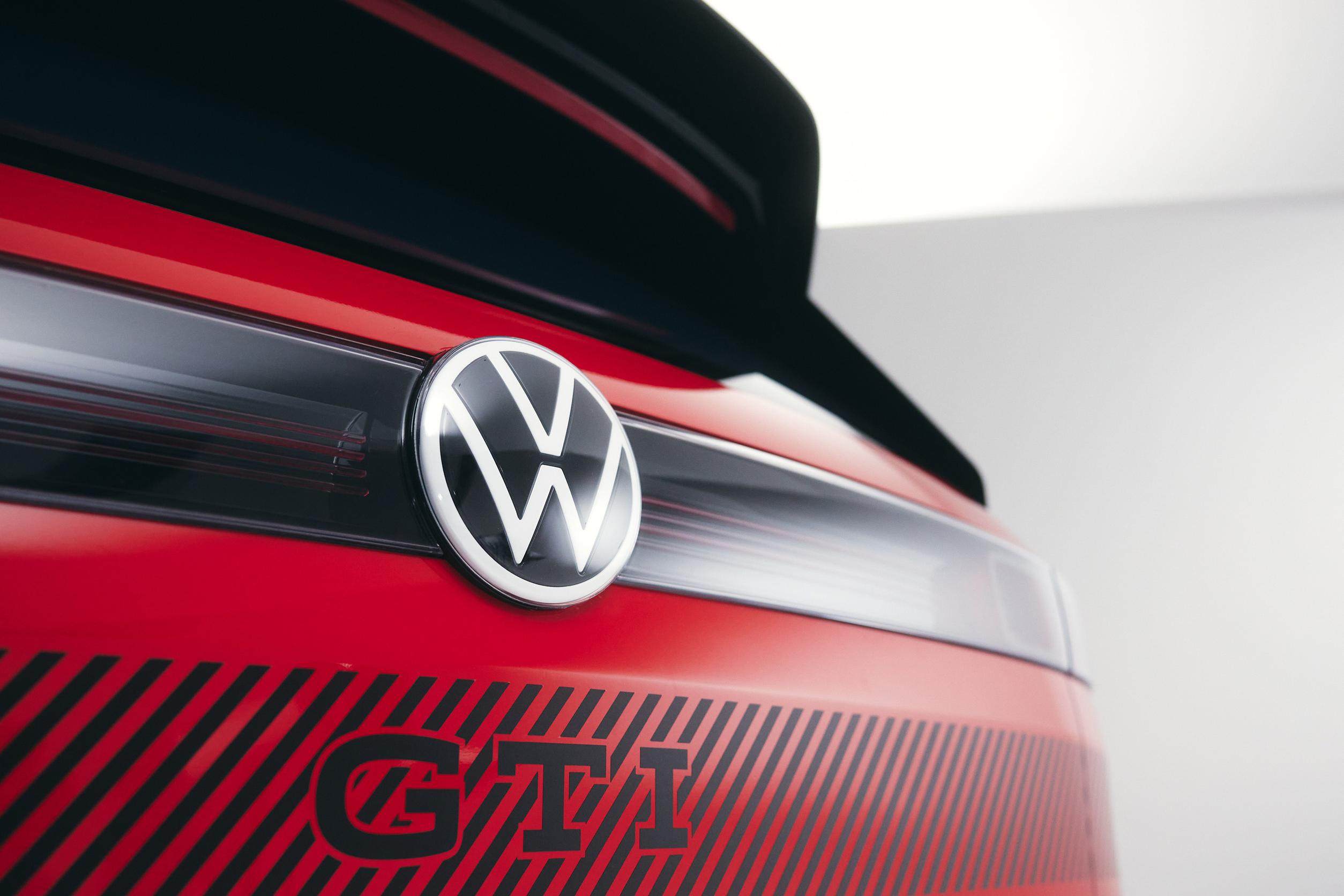 在尾灯下方的黑色斜纹装饰其实是大有来头,它的设计灵感来源于第一代高尔夫GTI黑色保险杠主题风格,“GTI”标识放置于中间区域,进一步坐实了它的身份。另外,宽大的尾翼、贯穿式高位刹车灯以及厚重的扰流板等设计,很好的渲染了大众ID.GTI的运动性能氛围。