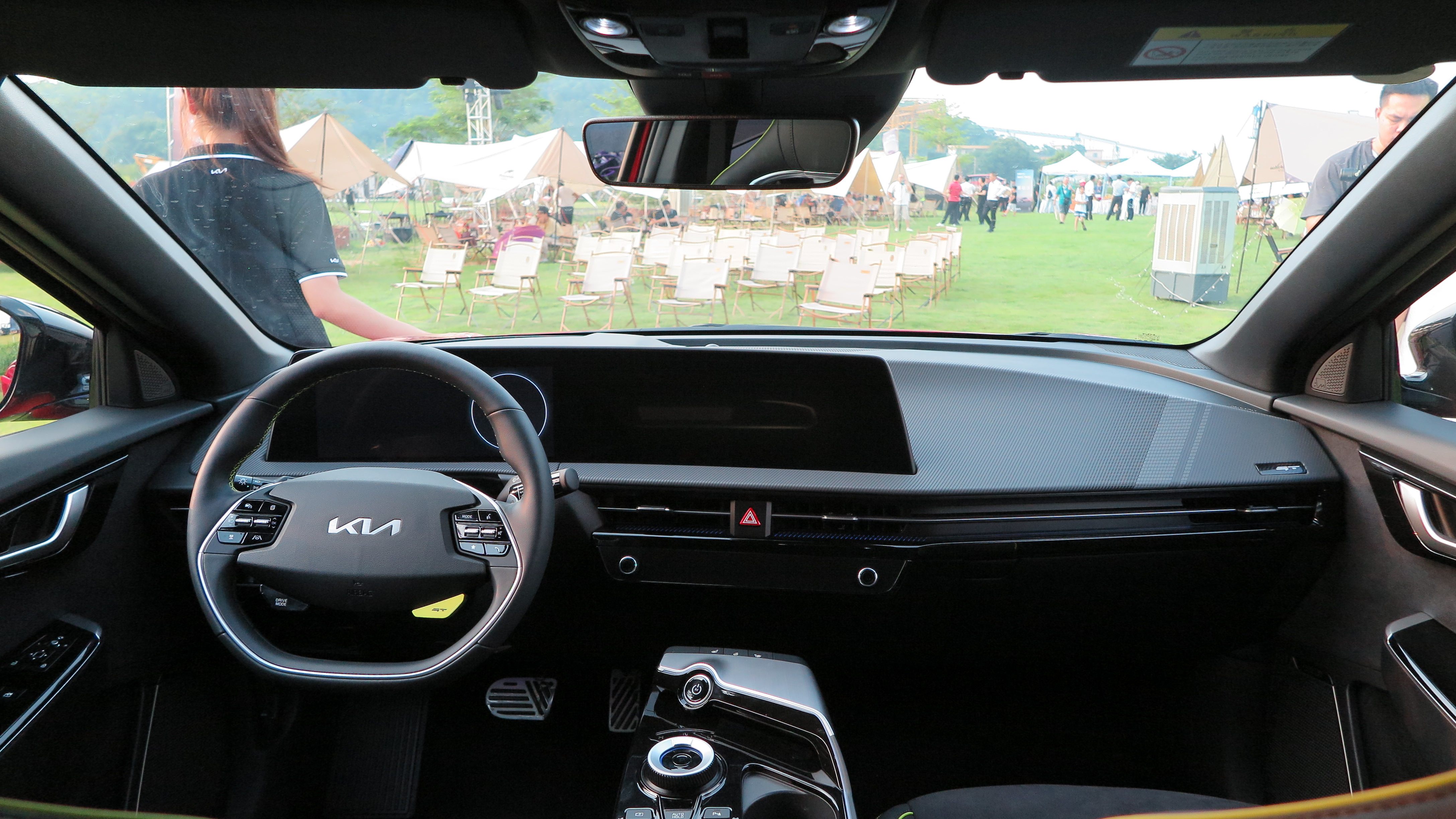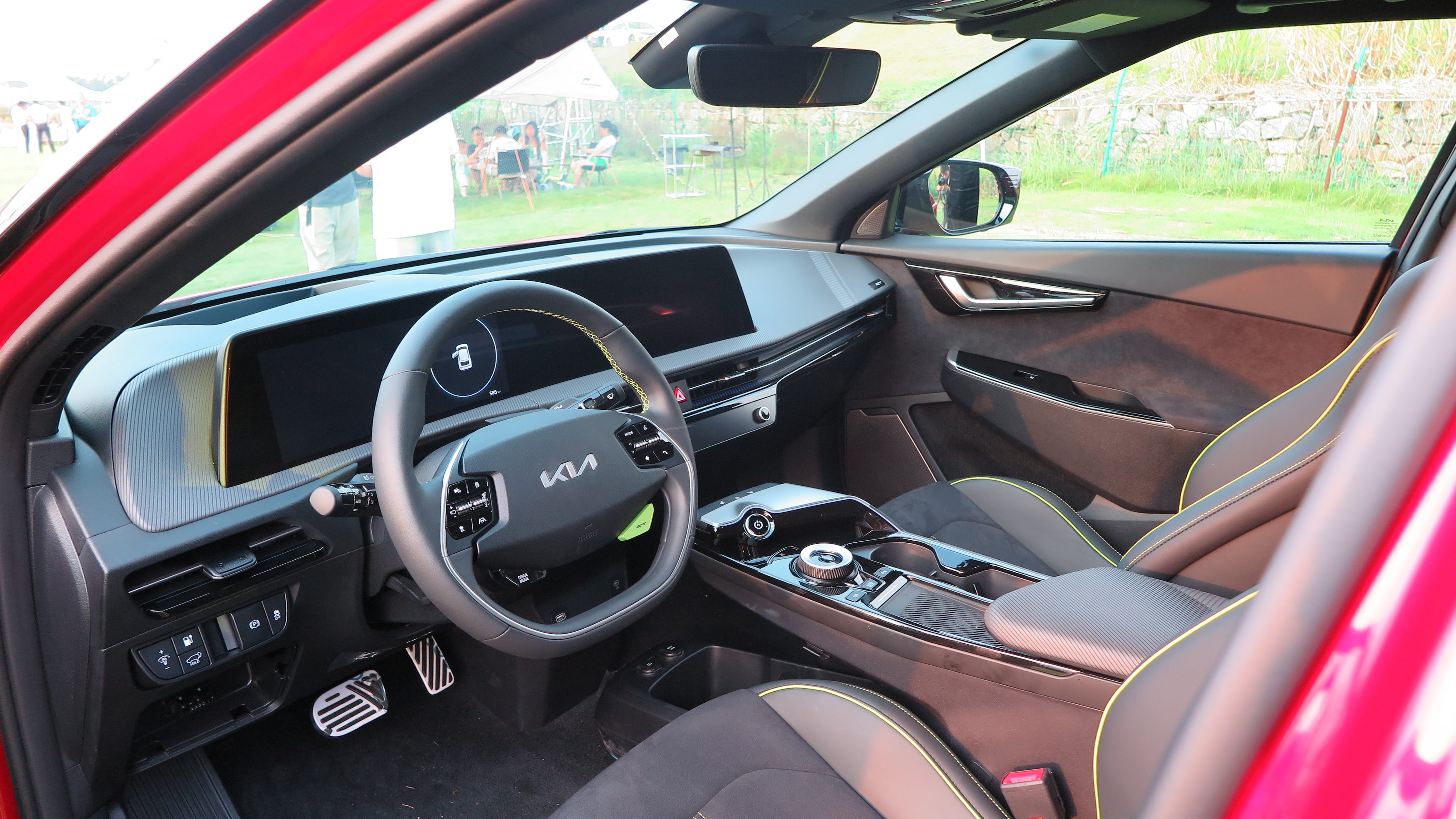 之所以说不简单,是因为它的驾驶室内用料相当丰富,并且颇有设计感。其中,GT车型配备了GT驾驶模式按钮、GT专属纹路、绒面革、方向盘荧光色缝线等多种设计元素,这些设计、用料都体现出了EV6 GT作为一款高性能轿跑运动风范。