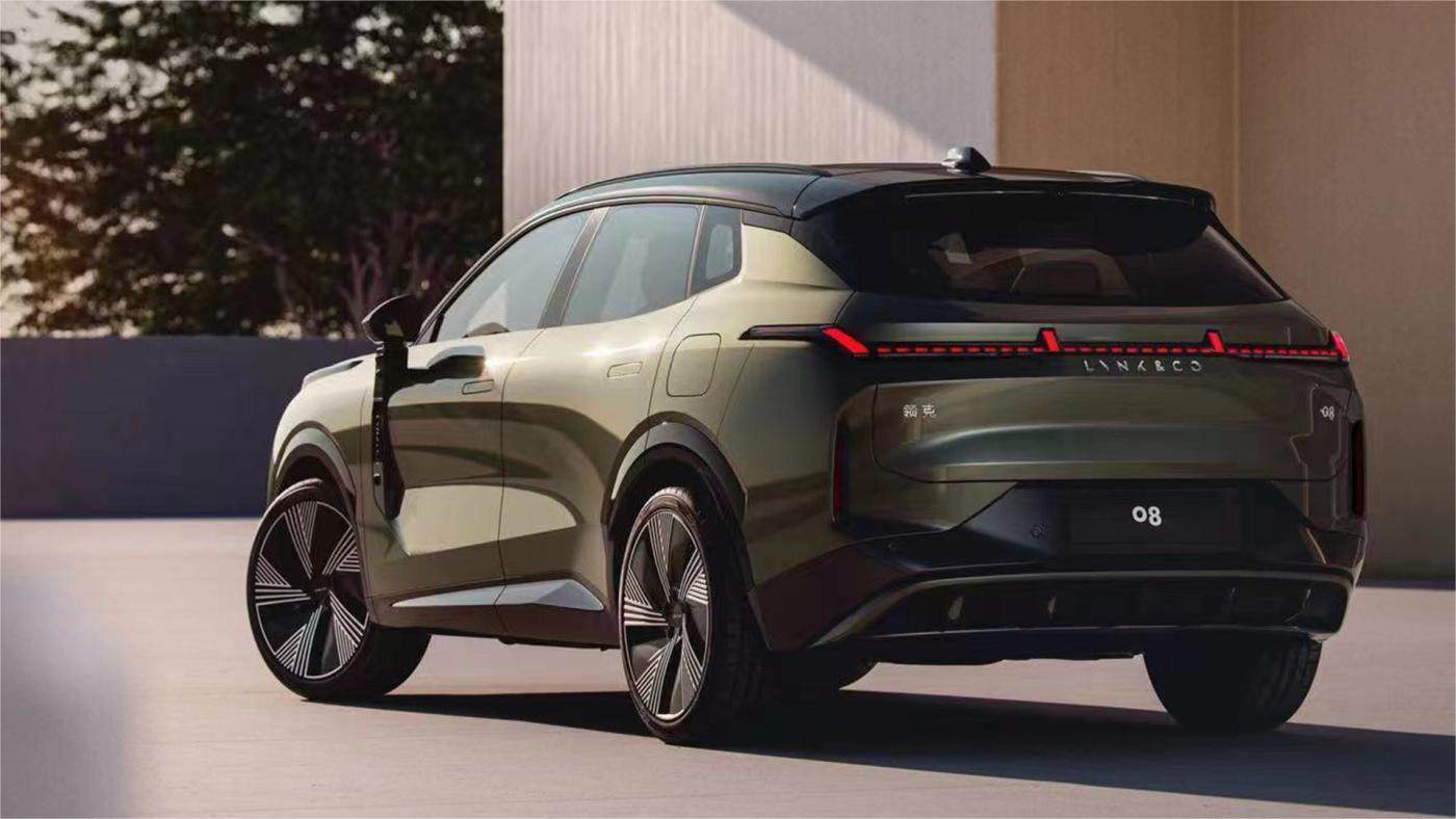 车尾部分,领克08经过全新设计的车尾同样也已经让我们几乎很难再在它身上找到以往领克车型的影子。新车采用了造型独特的盈能晶体贯穿式尾灯。狭长的尾灯与隐藏式后雨刮结合,让整个尾部显得非常简洁。