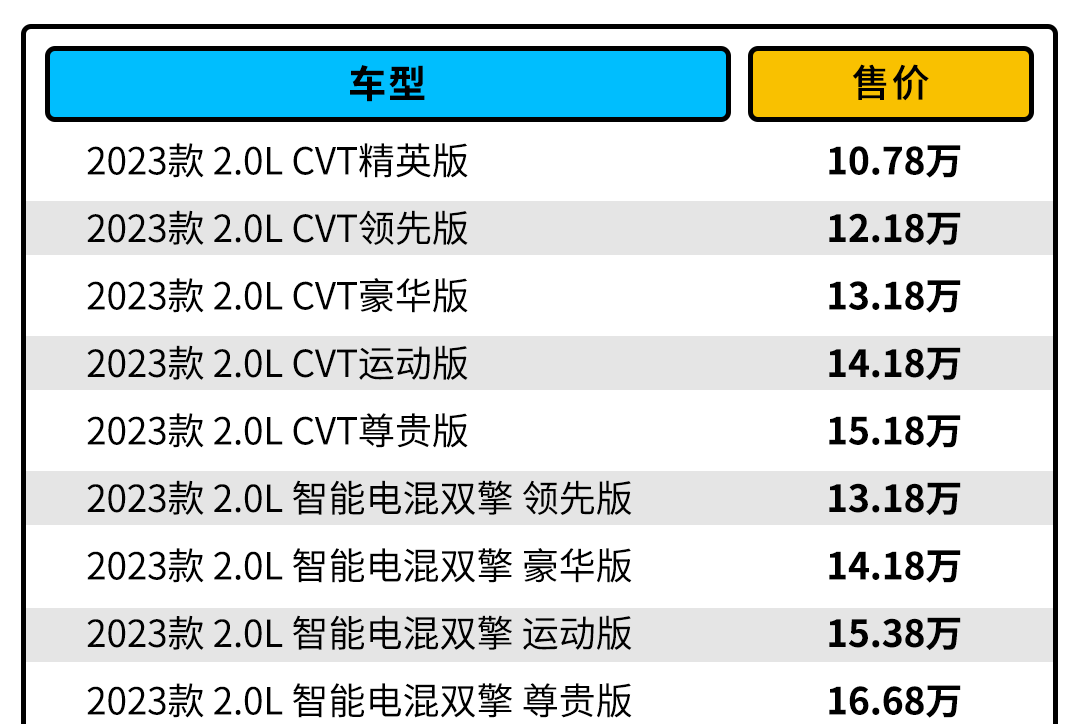 而另外一边就是混动版本了,该版本该电混双擎版的起售价要比燃油版贵了2.4w,提供一台低功率版的2.0L发动机+电机的动力系统,电机可输出最大功率83kW(113Ps),峰值扭矩206N·m,匹配E-CVT无极变速箱,相比燃油版,混动版的动力响应更为迅速,也更省油了,WLTC综合油耗4.58L。