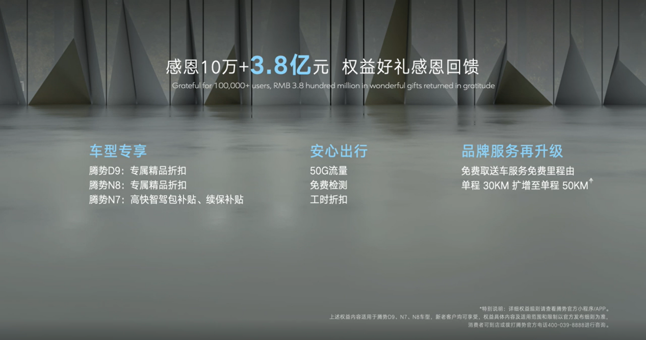 9月23日,腾势D9迎来了第10万台量产车下线的高光时刻!这是腾势汽车的又一里程碑式跨越!也创下了最快达到10万台量产车的新能源豪华车型的行业记录。腾势品牌一直以用户需求为核心要素,始终秉持创造全优出行的理念,为了感恩10万+用户,9月26日,腾势N7智能沟通会正式启幕,官宣全系车型可选装首搭新一代NVIDIA DRIVE Orin®平台,更深度赋能腾势N7的智驾能力,实现高速快速路智驾的推进与落地 。此外,更推出价值高达3.8亿的感恩好礼,以超值权益回馈十万+用户信赖!