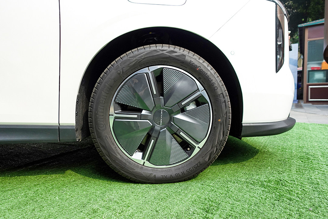 轮胎规格为225 55 R18,实拍车型配备型号为马牌EcoContact 6Q,属于节能向轮胎。轮毂为18英寸低风阻式设计,与车型还挺般配。