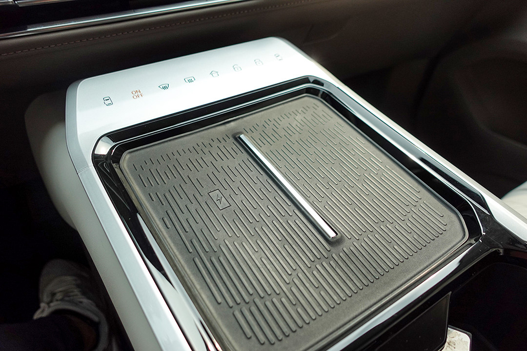 中部扶手是岛式设计的,上方最前部是触控按键,诸如电动侧门、空调、门锁等,后方还带有两个手机放置区域,但仅有左侧的带有手机无线充电功能。