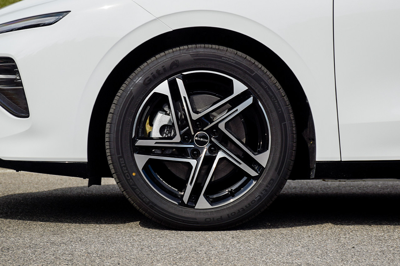 实拍车辆的轮圈为18英寸,采用了双五辐设计,内部造型呈放射状,这种设计的好处在于可以让轮圈更显大一些,从而提升视觉冲击力和品质感。轮胎尺寸为255/50 R18,型号为佳通驾控P10系列。