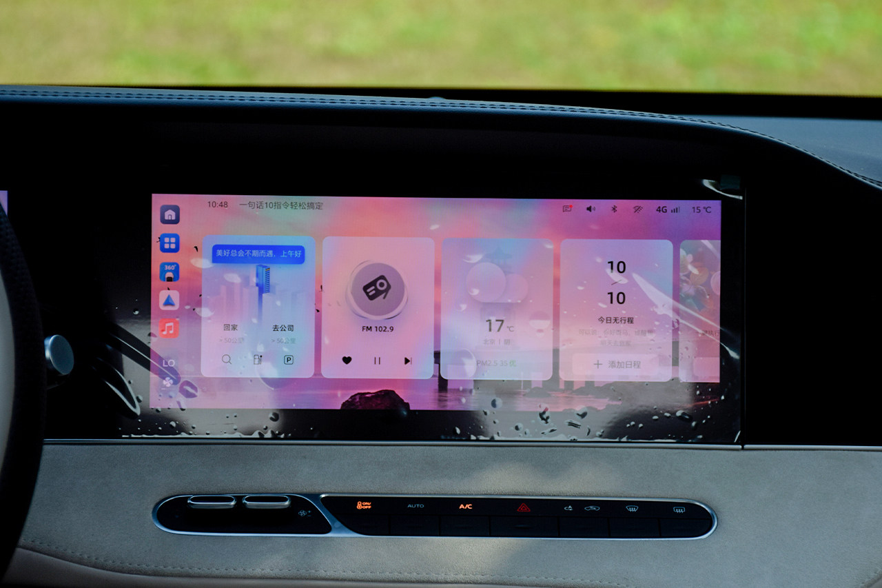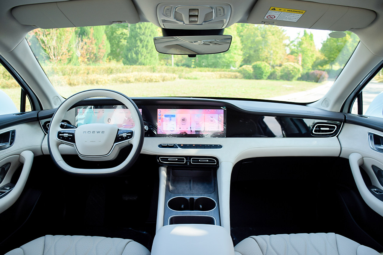 内饰层面,教授实拍的车型采用了浅色配色,拉开之后温馨感扑面而来,整体采用环保式布局,中控台较为平直,贯穿整个座舱,和外观一样,遵循的也是优雅、舒展的感受。左侧是双12.3英寸的全液晶仪表和中控屏幕,并且采用了怀挡,简化了前排的设计元素。