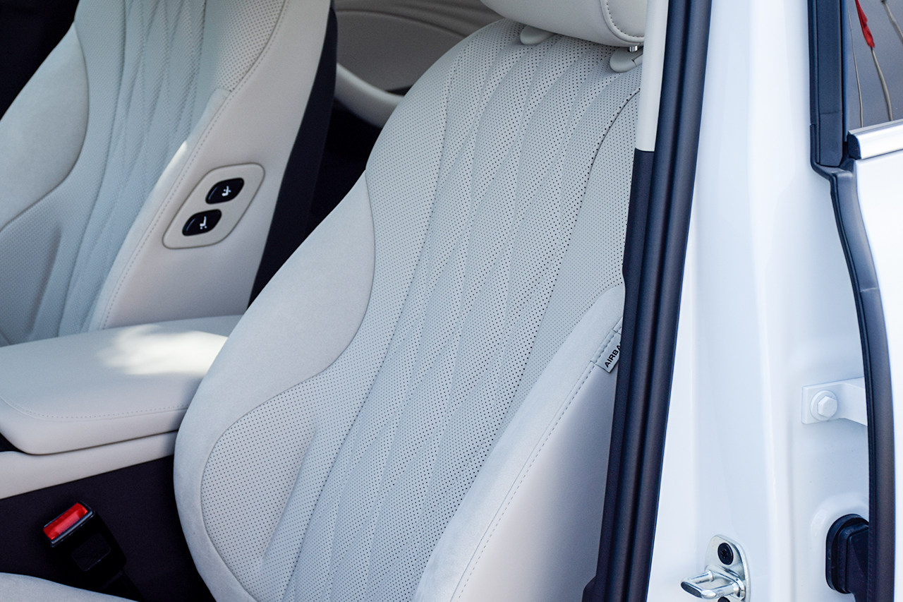 除了出色的舒适性,这套座椅的档次感也很不错,表面是麂皮包裹,配合座椅中间的波浪缝线,高级感一下就出来了。