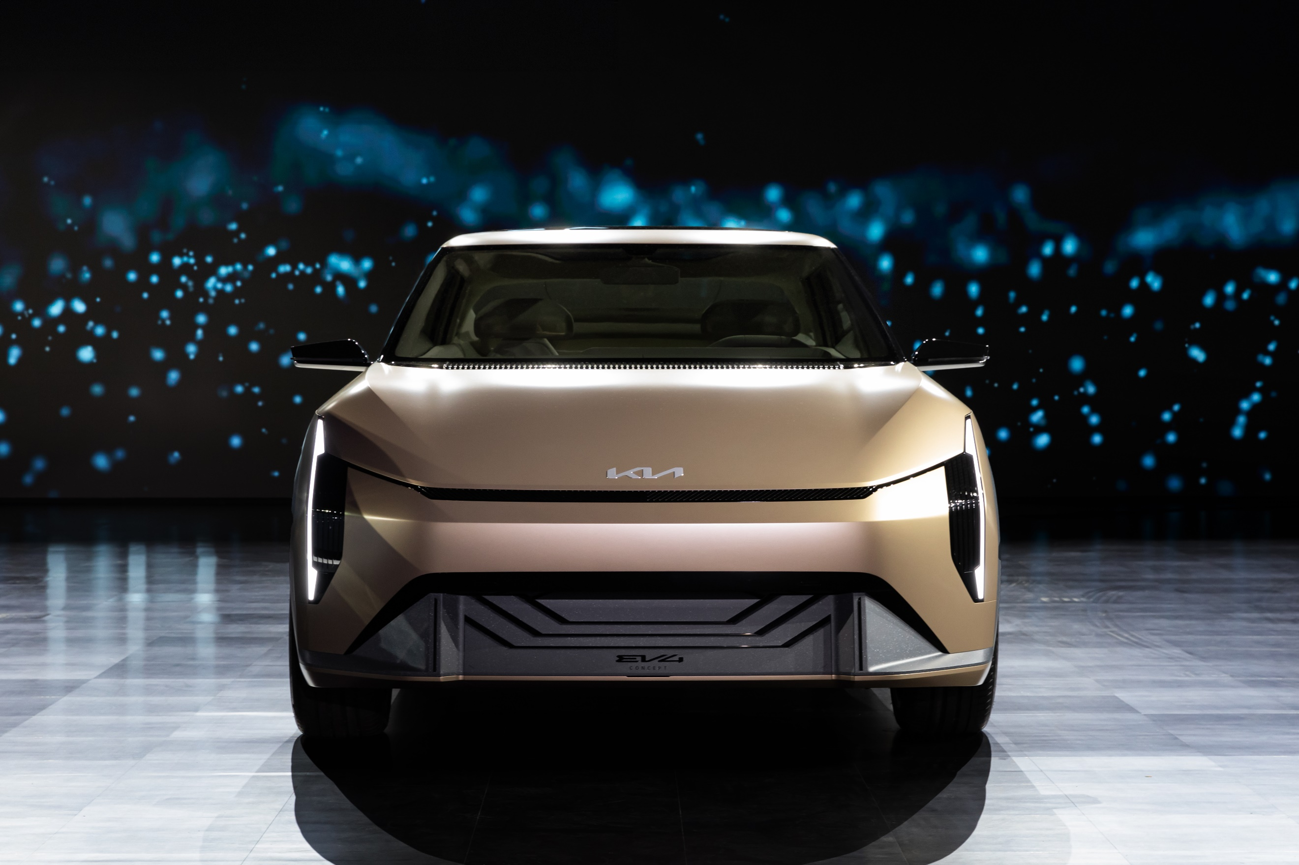 硬朗的前脸设计与EV4概念车前卫和具有科技感的轮廓相得益彰。EV4拥有宽阔、气势恢宏的车身姿态,前照灯垂直置于发动机罩和前保险杠的最外缘,象征着起亚突破界限、加速推进电动汽车革命的决心。