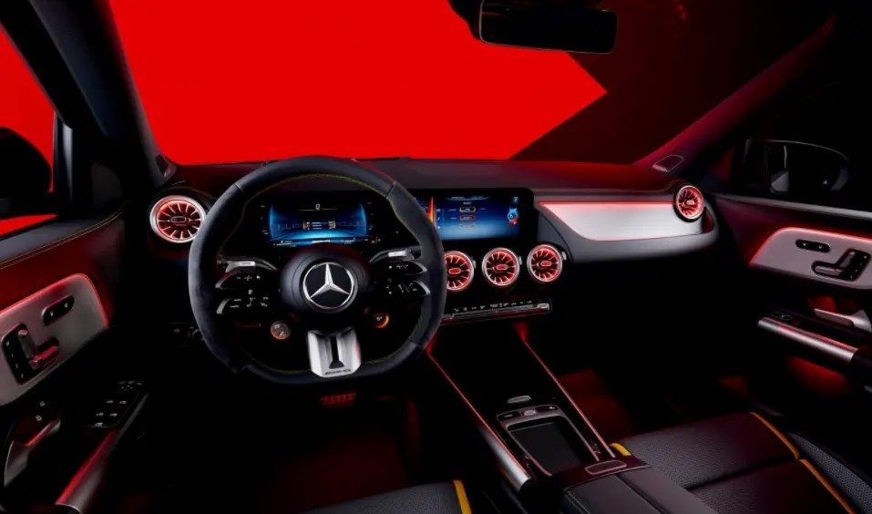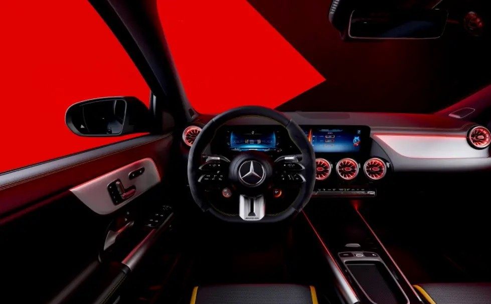 内饰方面,和其他AMG车型一样,新款AMG GLA 45S同样拥有许多标志性的座舱设计,包括AMG专属的方向盘、驾驶程序切换、悬浮式大尺寸双联屏、炮筒式空调出风口以及一体式运动座椅,配上黄色饰条的点缀,战斗气息十分凸显。