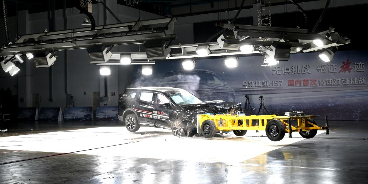 2023年10月17日,一汽红旗携旗下全新红旗HS7在天津中汽中心实车碰撞试验室成功完成了国内首次车辆腐蚀对碰挑战,并以出色的成绩成功通过TOP Safety极限考验。
