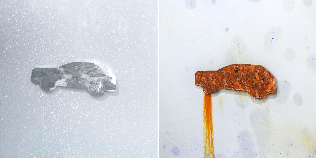 本次挑战首先将试验车辆进行720小时不间断的盐水喷淋,盐水渗透过金属材料表面,对车身材料造成腐蚀,相当于正常用车环境中,表层7-8年的腐蚀老化程度。为了对比盐水喷淋试验后车辆的腐蚀效果,与试验车一同进入试验舱的还有一块金属片,同样经历720小时的喷淋试验,试验车辆车漆表面良好,而金属片则锈迹斑斑,腐蚀严重,强度减弱。可见全新红旗HS7抗锈蚀的第一道防线在整体盐水喷淋挑战中表现亮眼。