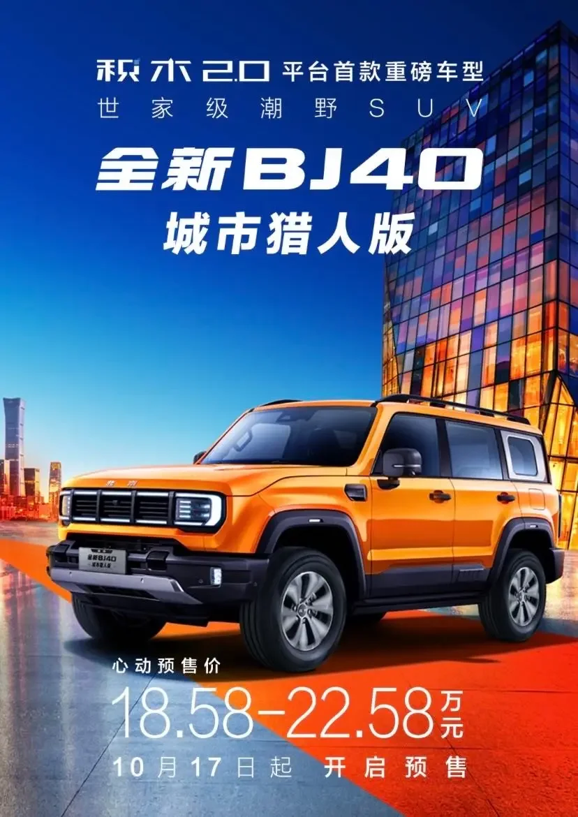 近日,北京越野官方正式发布了全新一代北京BJ40车型并开启预售,新车型的预售价格为18.58-22.58万元,共推出三款城市猎人版车型,预计其自最快将在今年11月份内正式宣布上市发售。