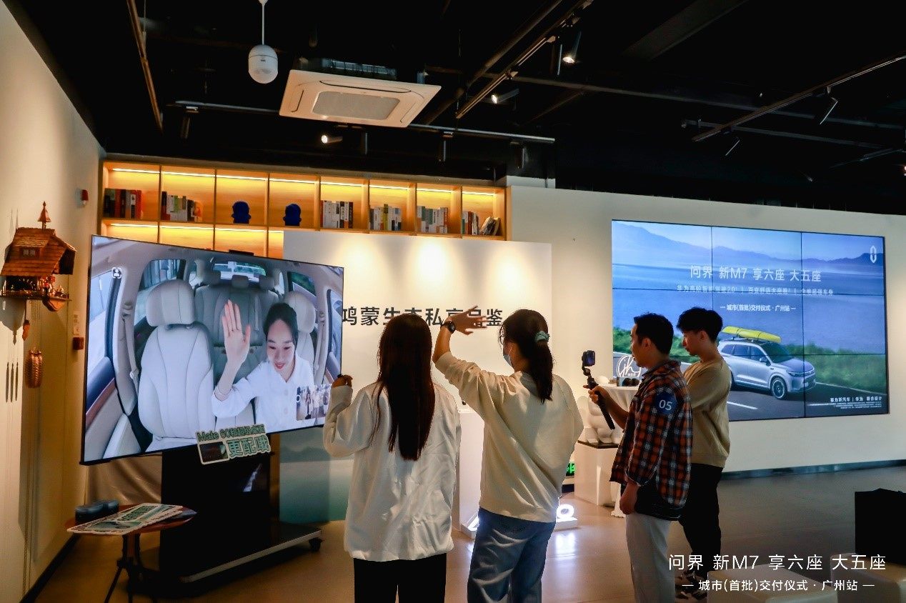 此外, HUAWEI智慧屏V5 Pro、HUAWEI Mate 60系列也在本次交付活动中闪耀亮相,通过华为畅连App实现车内跟家里华为智慧屏视频通话。通过超级桌面实现了手机应用的无缝衔接。在交付现场人们不仅感受到AITO问界新M7大五座与华为产品实现了真正的鸿蒙全场景互联,也借其特性为用户提供了更加愉悦的驾驶和乘坐体验,”鸿蒙全场景互联“真正在这里得以体现。也相信随着科技的发展,AITO问界汽车将为人们的生活出行带来更多更便捷、更高效的体验。