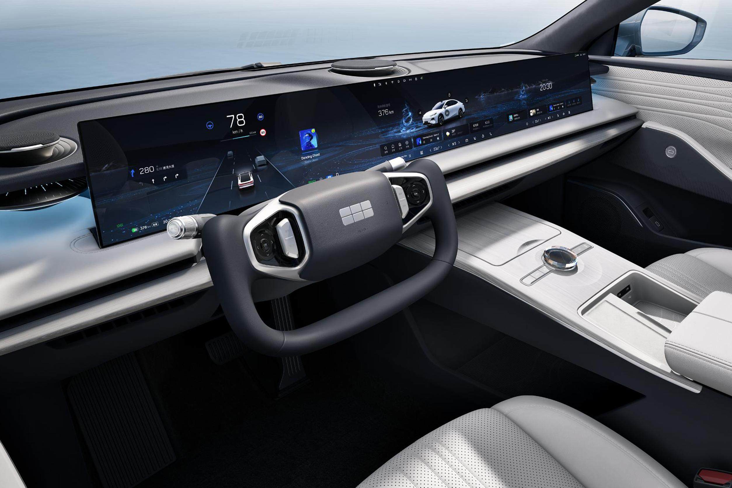 除此之外,银河E8还配备了造型独特的音响,据称其灵感来源于杭州西湖十景之一“三潭印月”,也还有异型方向盘等等个性设计,配以不错的内饰用料,整体质感尚可。