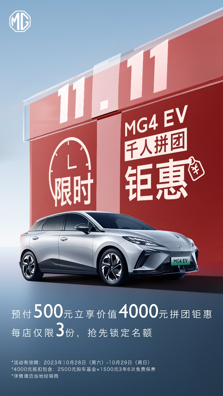 “中国人的首款全球车”MG4 EV再度问鼎“欧洲纯电紧凑车销量冠军”!为庆祝这一令人鼓舞的时刻以及回馈广大用户一直以来的支持与信赖,MG品牌推出惊喜福利,开启MG4 EV“千人拼团钜惠”限时活动。10月28日至10月29日期间,购买MG4 EV全系车型,可享受500元抵4000元权益,包含价值2500元的购车基金以及价值1500元的3年6次免费保养。每店仅限3个名额,机会难得,速速来领!
