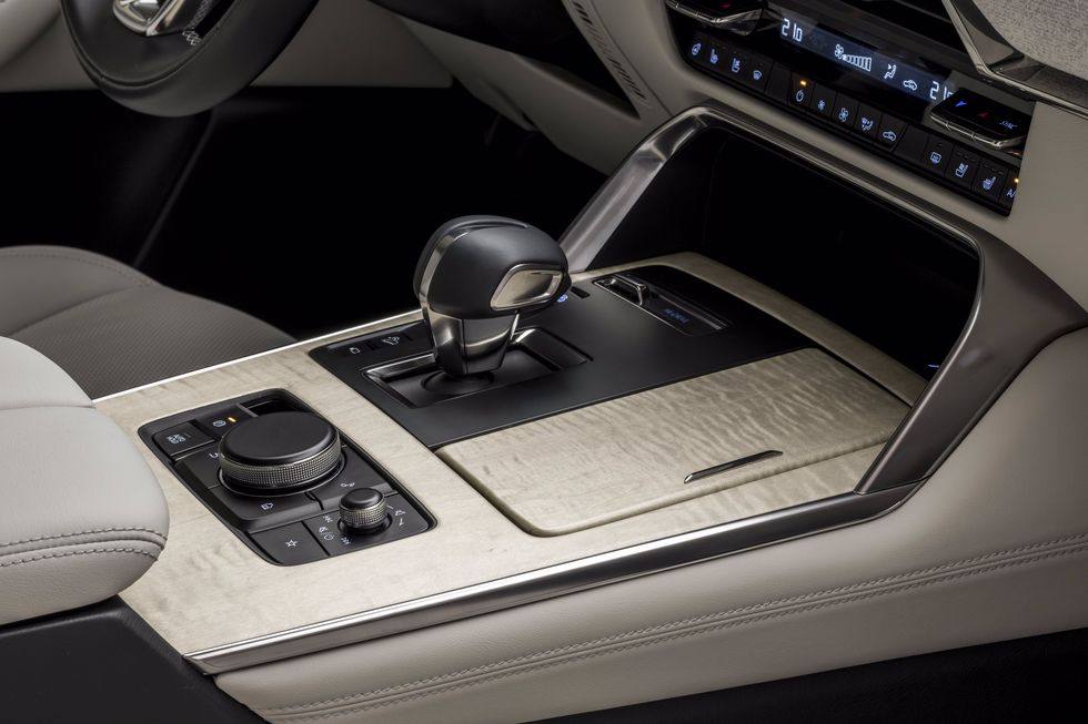 看到内饰,CX-70配备Nappa真皮座椅,内部采用大面积的麂皮与木纹饰板,看起来非常豪华,方向盘采用三幅式设计,整个内饰看起来非常简洁干练,在空调出风口下方还保留了实体按键,新车搭载Carplay和Android Auto,采用一块12.3英寸的中控屏,配有旋钮操控。