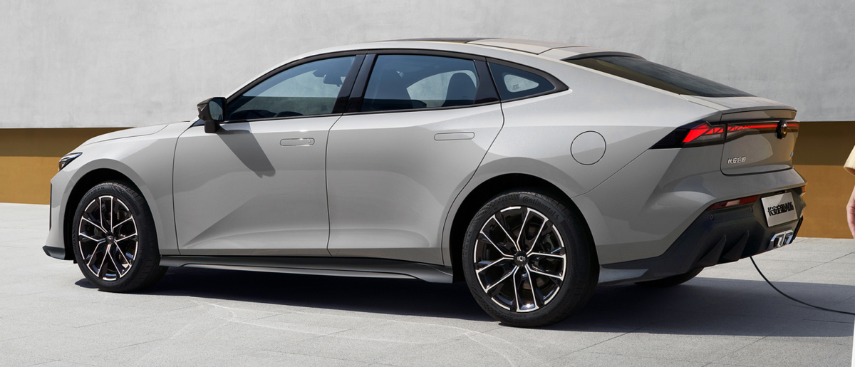 车身侧面,启源A06与UNI-V基本一致,新车都是以溜背的轿跑造型呈现,并配备隐藏式门把手,整个造型相对运动。与长安UNI-V不同的是,新车换上全新样式的大尺寸轮毂,进一步提升了新车质感。