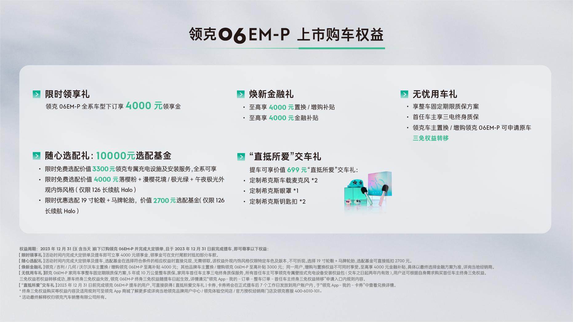 值得一提的是,在新车上市之际,领克汽车官方还为在2023年12月31日前购车的用户推出了4000元限时领享礼、至高4000元新金融礼、无忧用车礼、10000元随心选配礼,以及“直抵所爱”交车礼五重购车权益。