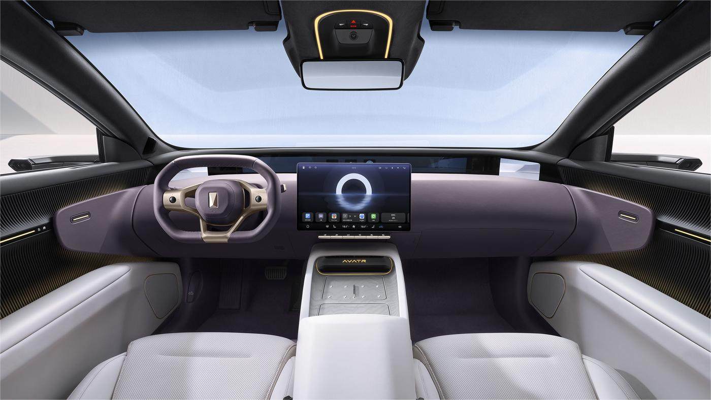 另外,为了提升与用户的交互感和仪式感,阿维塔12的前机盖与前挡风玻璃之间还配备了一块上弦月造型的HALO屏,这块屏幕让整车显得更加别具一格。