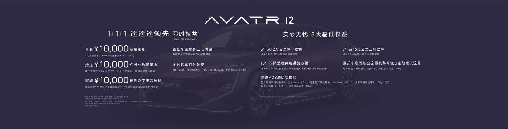 上市销售政策方面,在12月31日前下定的用户可以享受首任车主终身三电质保、5000元定金抵扣15000元车款、赠送10000元个性化选配基金、价值10000元的前排双零重力座椅等5重购车权益以及12重车主基础权益。