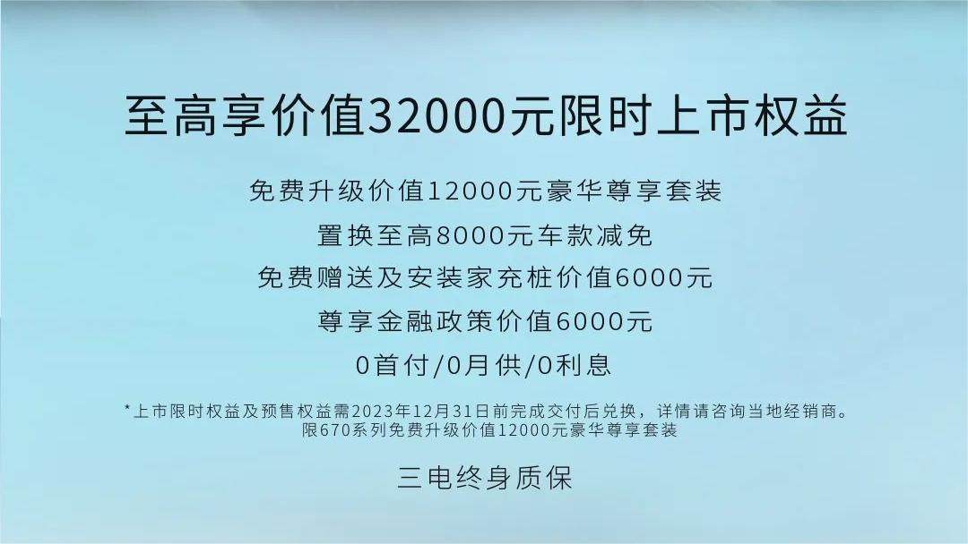 另外,在12月31日前购车并交付的用户还可以享受包括年费升级价值12000元豪华尊享套装(仅限670系列车型)、置换至高减免8000元车款在内至高价值32000元限时上市权益。