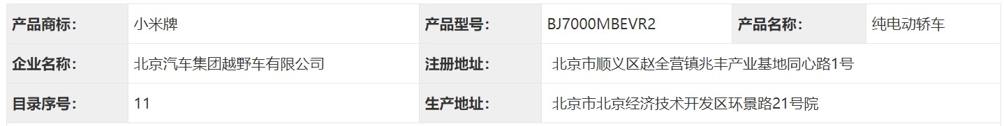 尽管小米汽车使用的是北京汽车集团越野车有限公司的生产资质,但生产地址却是北京经济技术开发区环景路21号院,而这个地址正是小米汽车自建工厂所在地。虽然小米汽车并没有获得属于自己的生产资质,但它的首款车型确实是出自自家工厂。