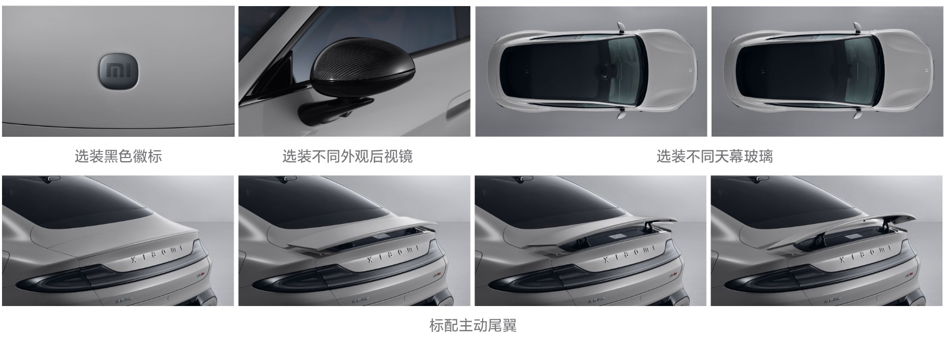 在外观设计细节方面,小米汽车车头配备了价值200万元的“MI”字徽标,并且部分车型版本还提供了黑色徽标。车身侧面提供了车身同色和碳纤维(暂不清楚是碳纤维材质还是碳纤维质感)外后视镜。车尾部分则标配了大尺寸的主动升降尾翼。