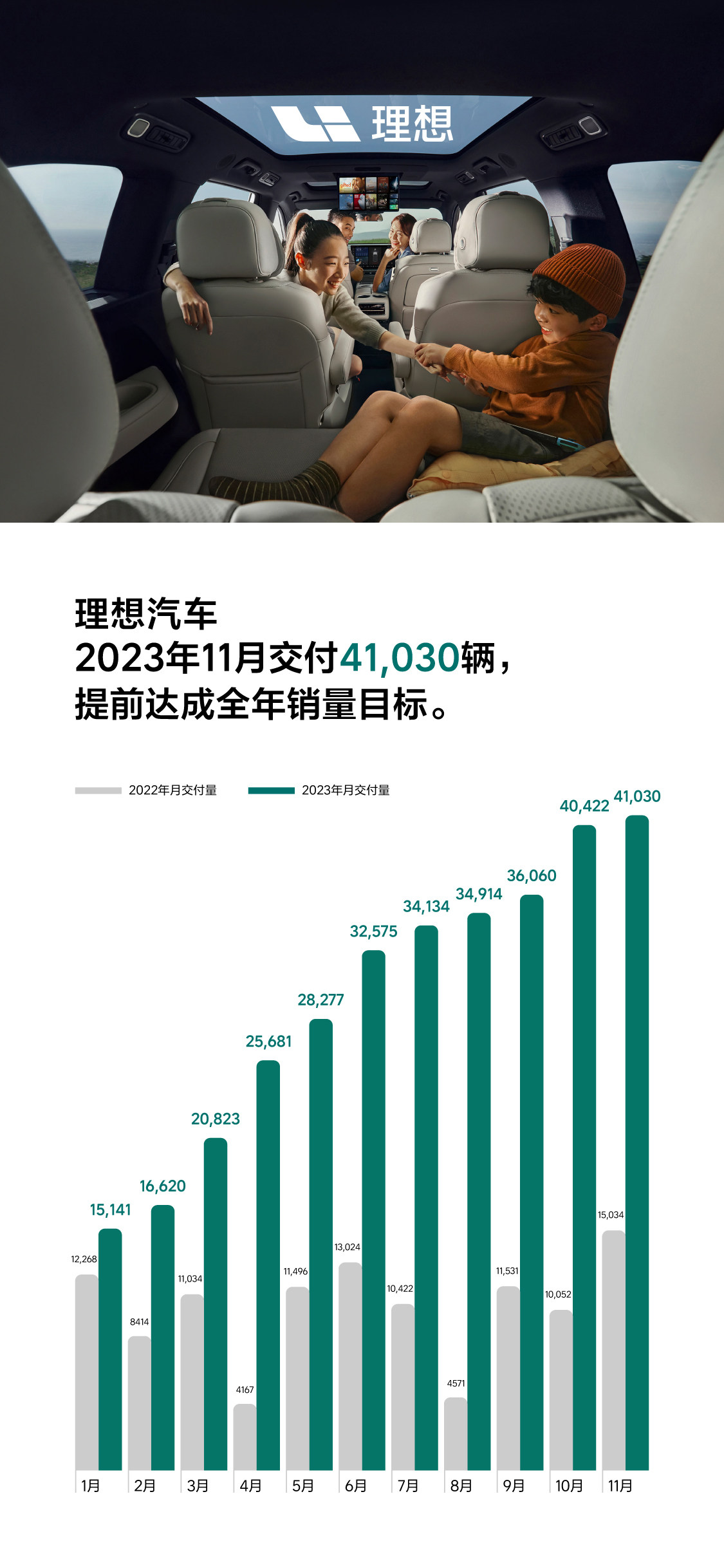 2023年12月1日,理想汽车公布2023年11月交付数据。2023年11月,理想汽车交付新车41,030辆,同比增长172.9%。截至2023年11月30日,理想汽车全年累计交付325,677辆,提前达成2023年30万辆销量目标。