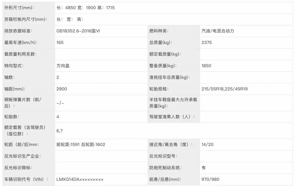 车型尺寸方面,新车长宽高分别为4850/1900/1740mm,轴距为2900mm,与燃油版车型相比并没有太大的差距,预计两者的内部空间表现也将会保持高度一致。