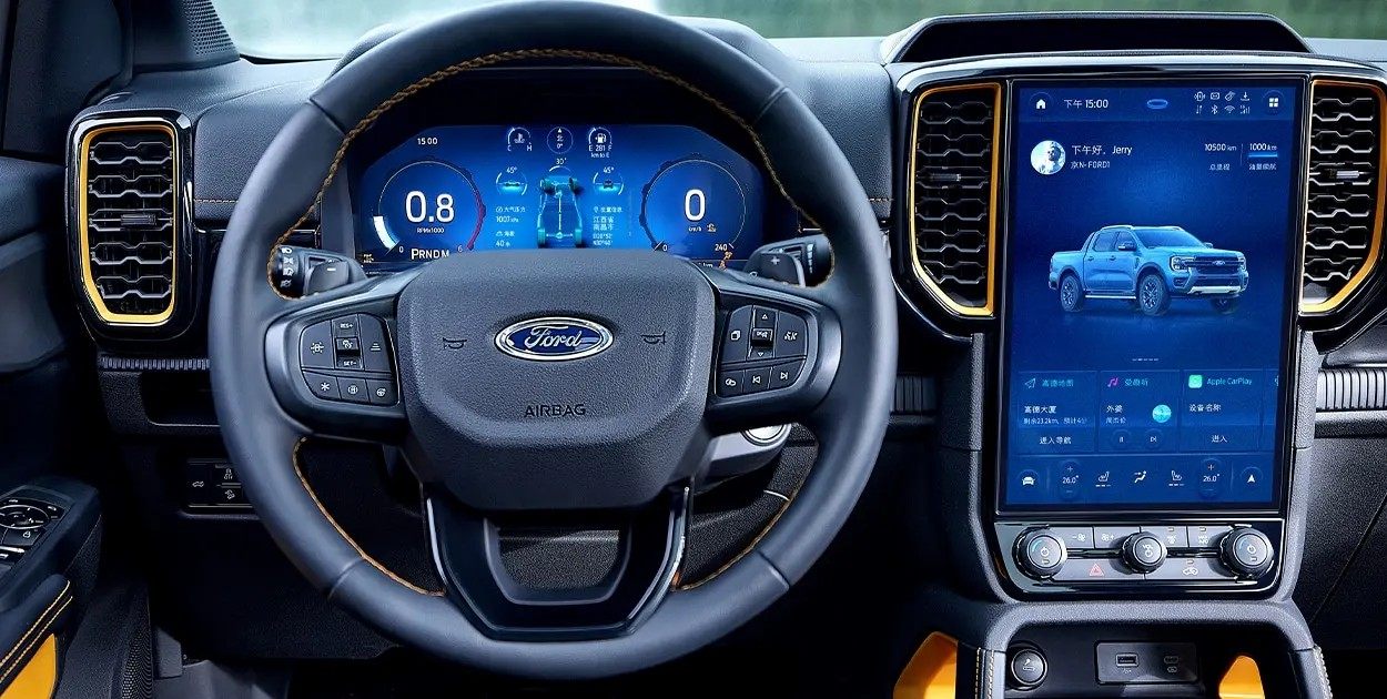 三幅式多功能方向盘、纵置大尺寸中控屏幕、液晶仪表以及各种皮质软性材料的点缀和撞色设计装饰都能在游骑侠Ranger上看见,质感领先于传统皮卡非常多。