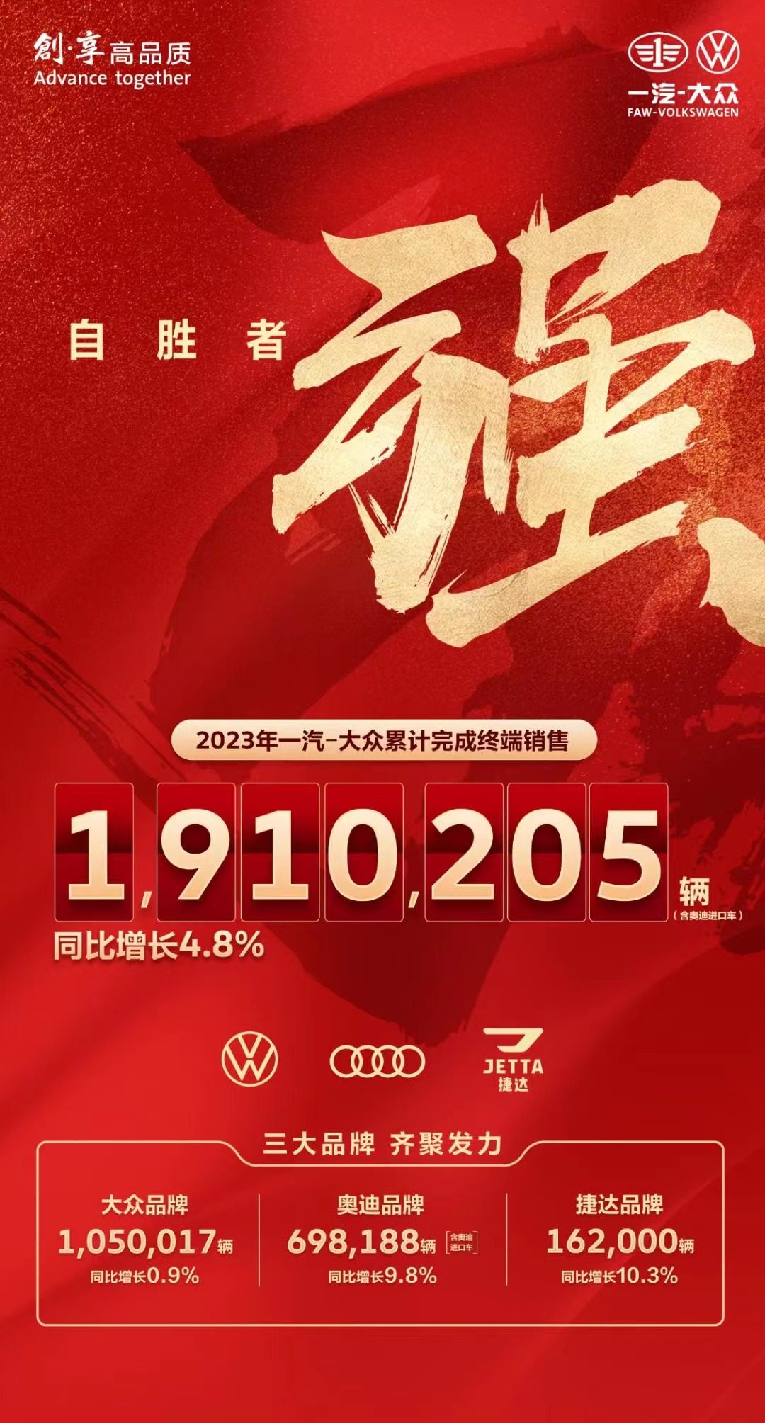 胜人者力,自胜者强。一汽-大众2023全年终端销量数据出炉,累计完成终端销售1,910,205辆(含奥迪进口车),同比增长4.8%。