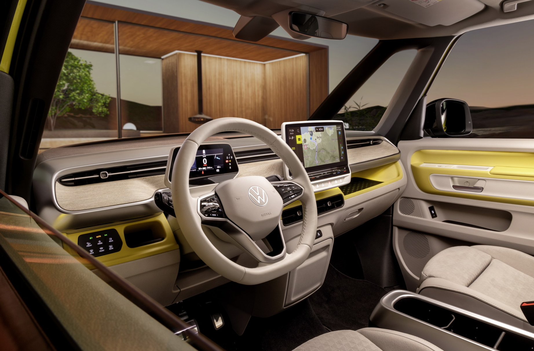 内饰方面,大众ID.Buzz没有太华丽的设计,基本延续ID.家族的液晶仪表搭配悬浮式中控屏,整个造型颇为简洁,并且内饰也是用暖白色进行搭配,进一步凸显新车内饰的宽敞。
