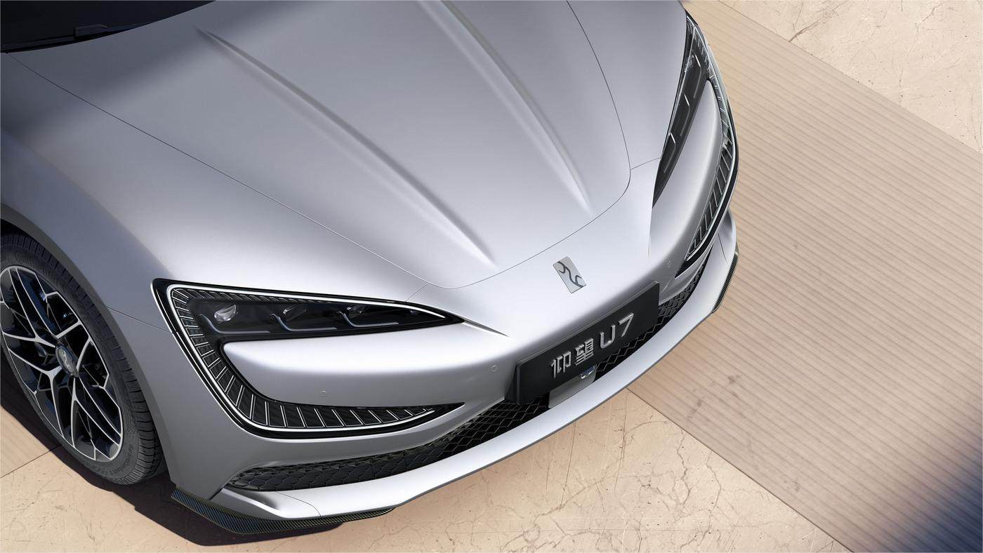 具体来看,仰望U7的前脸造型极具俯冲的姿态,前脸锋芒前卫的星际穿越大灯搭配筋线微微隆起的前舱盖,显得运动感十足。新车车身侧面非常修长动感,它高于前机盖的前轮翼子板形成了宽体的效果,侧面内陷的C字型腰线一直延伸到了车尾,显得非常有肌肉感。
