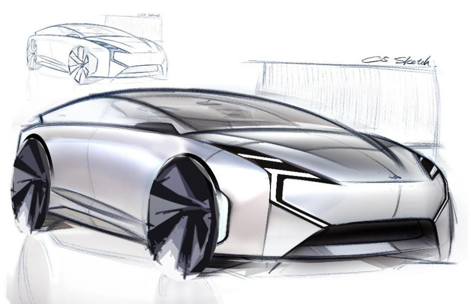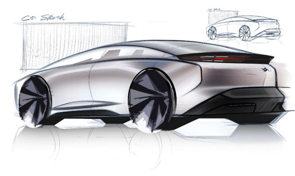 从设计草图来看,新车通过大量概念前瞻的一体化设计凸显除了未来极简主义。比如它采用了业内少见的隐藏在尾翼下方的悬浮式贯穿尾灯设计,让整体造型浑然天成,有着非常高的设计辨识度。