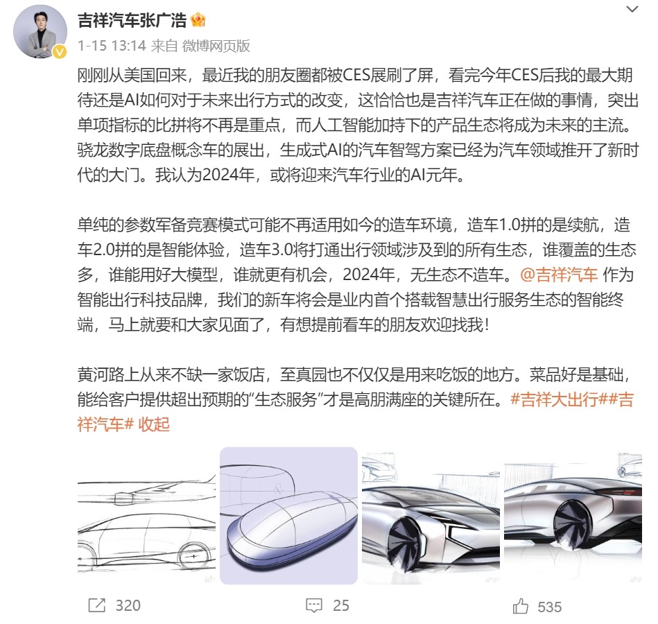 另外,张广浩表示,单纯的参数竞备模式可能不再适用如今的造车环境。2024年无生态不造车,谁覆盖的生态多,谁能用好大模型,谁就更有机会,而吉祥汽车作为智能出行科技品牌,将会是业内首个搭载智慧出行服务生态的智能终端。