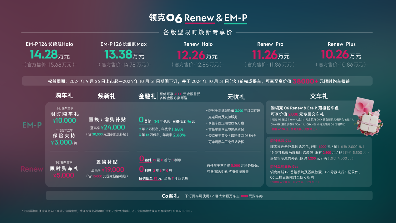 焕新而来的领克06家族为用户提供燃油、插电混动2种动力选择,共计5个版型。其中Renew版车型限时焕新专享价为10.26-12.26万元;EM-P车型限时焕新专享价为13.38-14.28万元。新车上市期间,领克06家族为用户打造“六重随心智选礼”。即日起,凡购车即可享受包括购车礼、交车礼、焕新礼、Co客礼、金融礼、无忧礼在内的限时权益,更有限时选装权益以及限时车载周边权益等福利。多重购车好礼,多元选装权益,不断刷新用户高价值拥车体验。